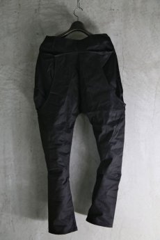 しっかりとしたハリとコシを持つストレッチ入りのドビーコットンで薄手ながらもコシがある為にその薄さを感じさせない重量感があります。ウエストサイド、ヒップのポケットの他に脇部分からヒップにかけての特殊な構造でさらに変形ポケットを配置しております。この部分のポケットがデザインとしても大きく映えて大胆な構造ながらも違和感のない仕上がりになっています。ワタリ巾に大きな余裕を持たせた立体変形サルエルパンツで裾を膝近くまで持ち上げる事でクォーターパンツのような穿き方も可能です。製品染めで生まれる僅かな染めムラも魅力的。