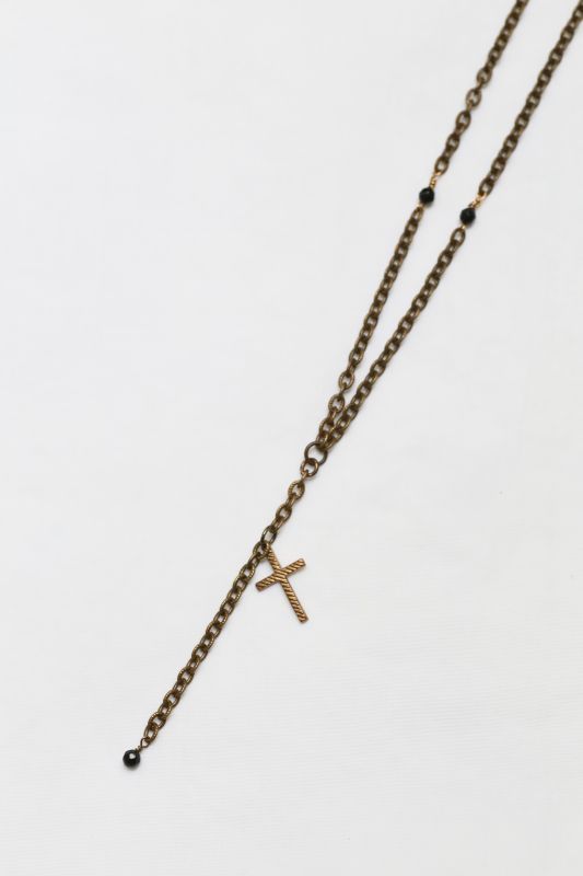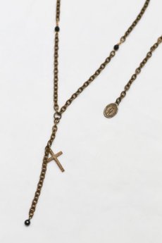 ロザリオ型のネックレスタイプでデザイン性の高いアイテムに仕上げました。動きの出るロザリオスタイルのトップにはスモールタイプの十字のクロスとそれに重ねてこちらもバランスの良いマリアチャームをセットで配置しました。クロスのトップの後ろにさりげなく揺れる天然石が素敵です。
