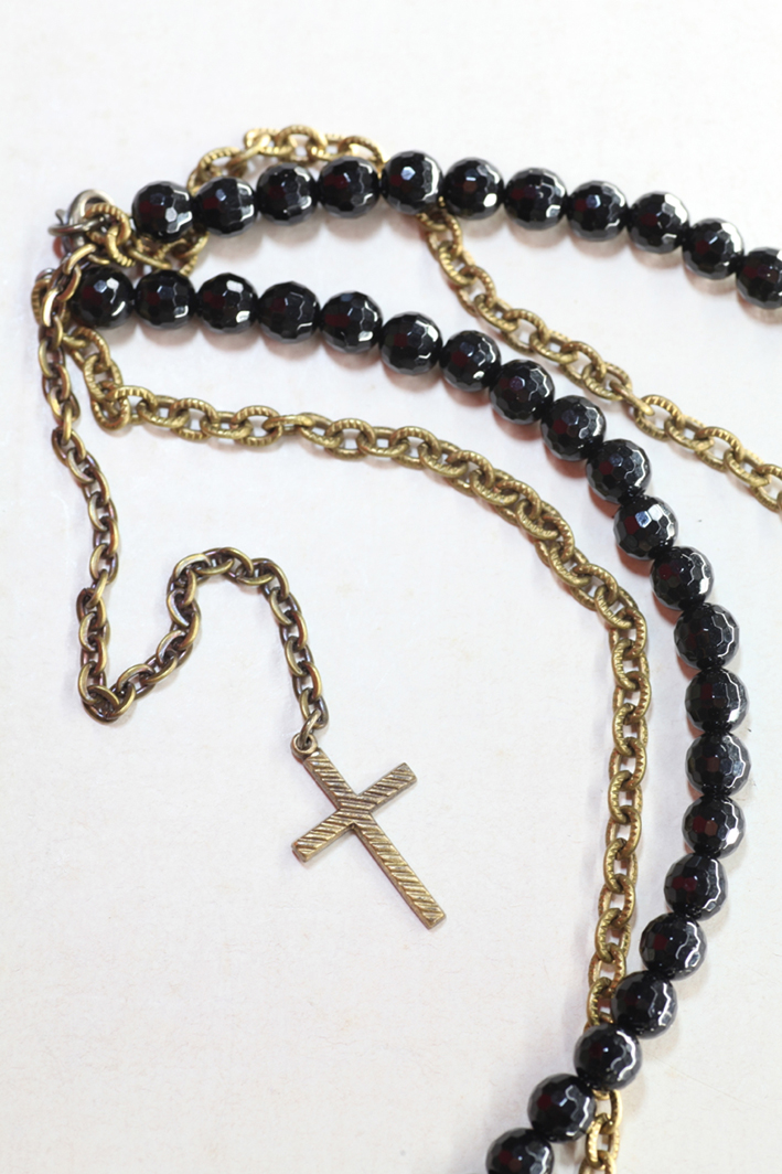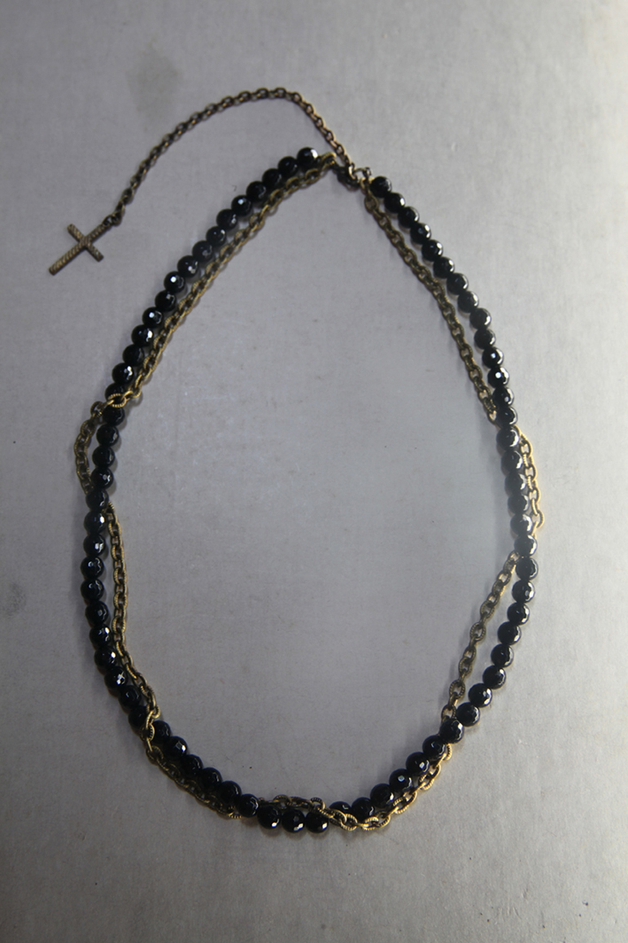 6mmの32面カット天然石とブラス製のチェーンをまとったダブルタイプのネックレス。少しだけ短めな設定でジャストに近い程度でネック周りを演出してくれます。エンド側についたスモールクロスの飾りがさりげなく優美さを演出します。(フロント側に垂らしてももちろん良いバランスです)