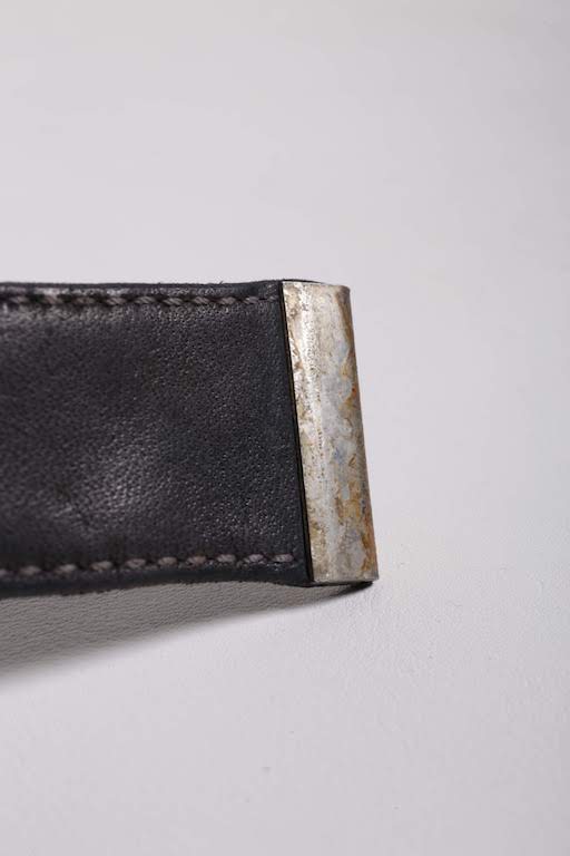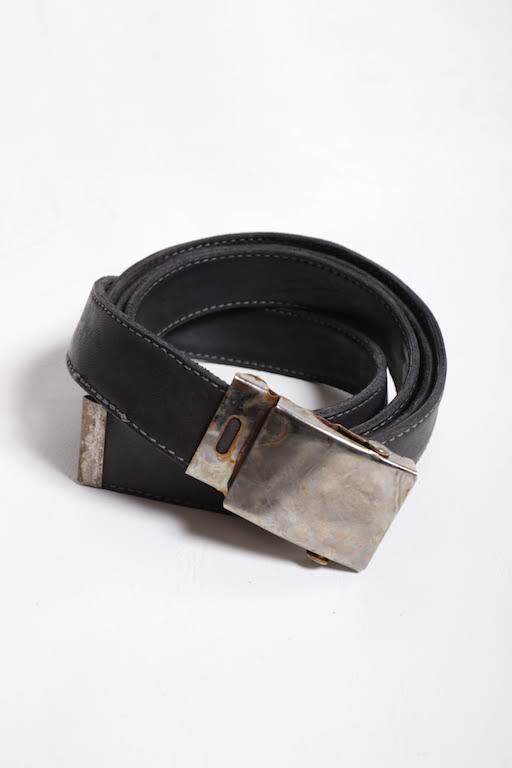 革本来が持つ傷や染色の際に付着したシミなどがむしろ退廃的で無骨な雰囲気を醸し出し、他のどこにもない存在感のあるベルトデザインへと落とし込まれた。