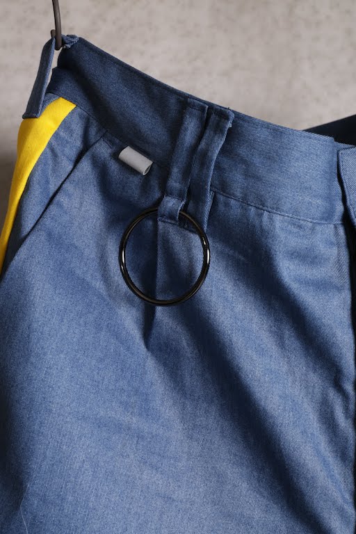 また、ウエストに配置されているこのブランドのアイコンディテールでもある丸カンをどう使うかも考えることも一つの楽しみになる作品である。