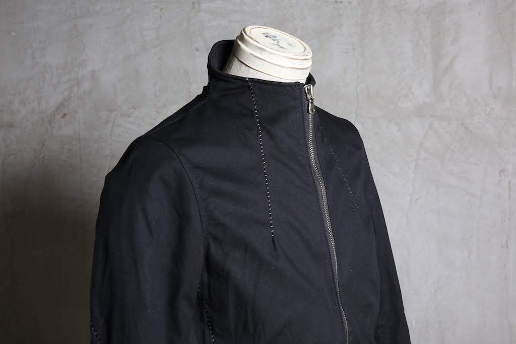 色の奥行きのある高密度の ストレッチオックスが無骨な匂いを放ち、ジグザグミシンを用いた特殊な縫製技術でモードな仕上がりを融合させた。