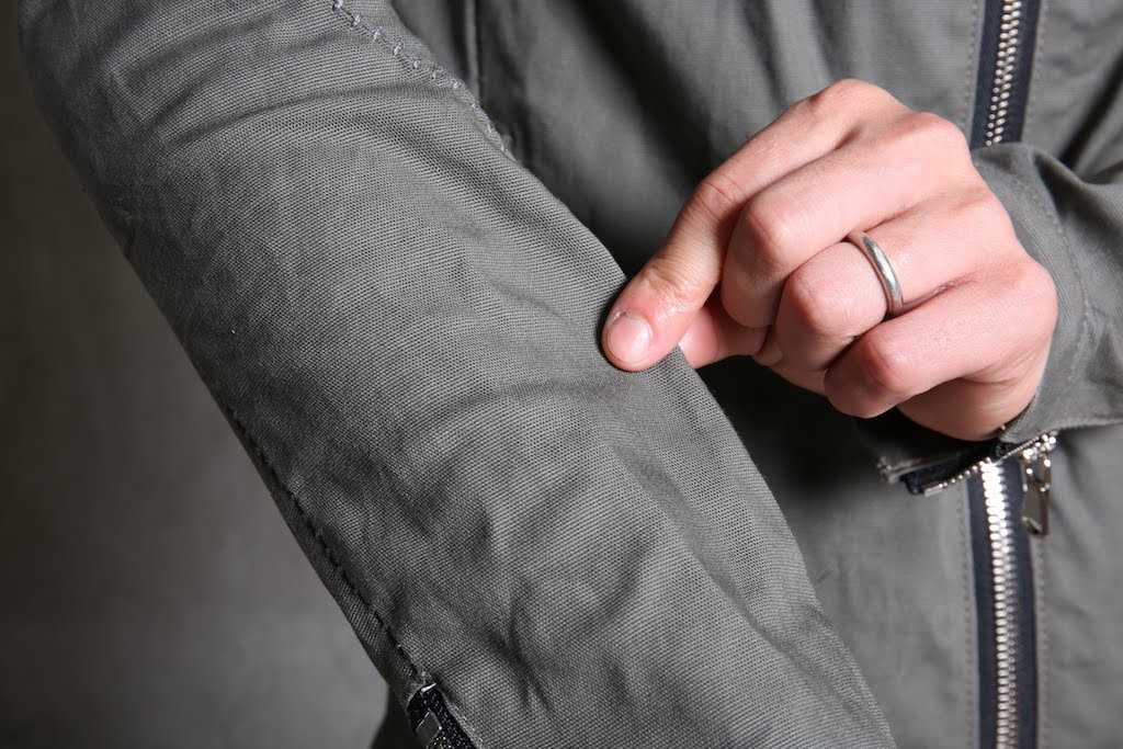 フロントと両袖先から美しい白銀の光沢を放つジップパーツはYKK社製の最高品質ライン「EXCELLA ZIP」を採用し、無機質かつ退廃的で過度な装飾を一切排除したこの作品をラグジュアリーに彩る。