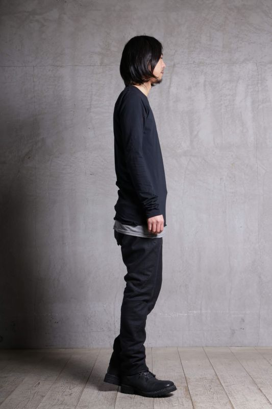 ネック、袖先、裾の各所には断ち切り加工を施し、退廃感を匂わせる仕上がりとなっている。