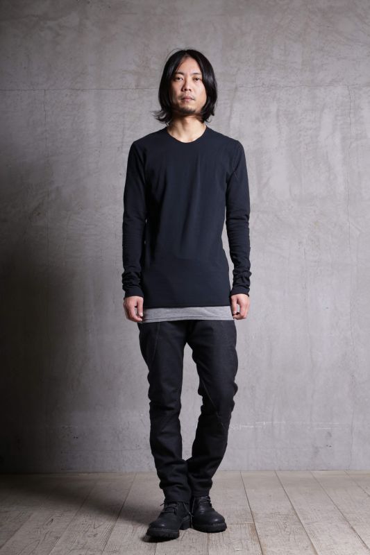 モード構築を目指したカットソーを作りたいと思ったのは、春や夏にはどうしてもシンプルになりがちな格好が多い中で 、他との線引き、画線化を目指したもの。一見しただけでは分かりづらいことなのだとしてもこのブランド持つある種の無個性的で無機的で退廃的なイメージを具現化したのがこのカットソー群でもあると思う。それは同時に「次」という向きへの指針でもあり象徴でもある。意識とイメージを具現化させていくのがデザインだとすればその先にあるのは常に進 化であり、その中でもブランドの個性としての不変性を持たせなければならない。
