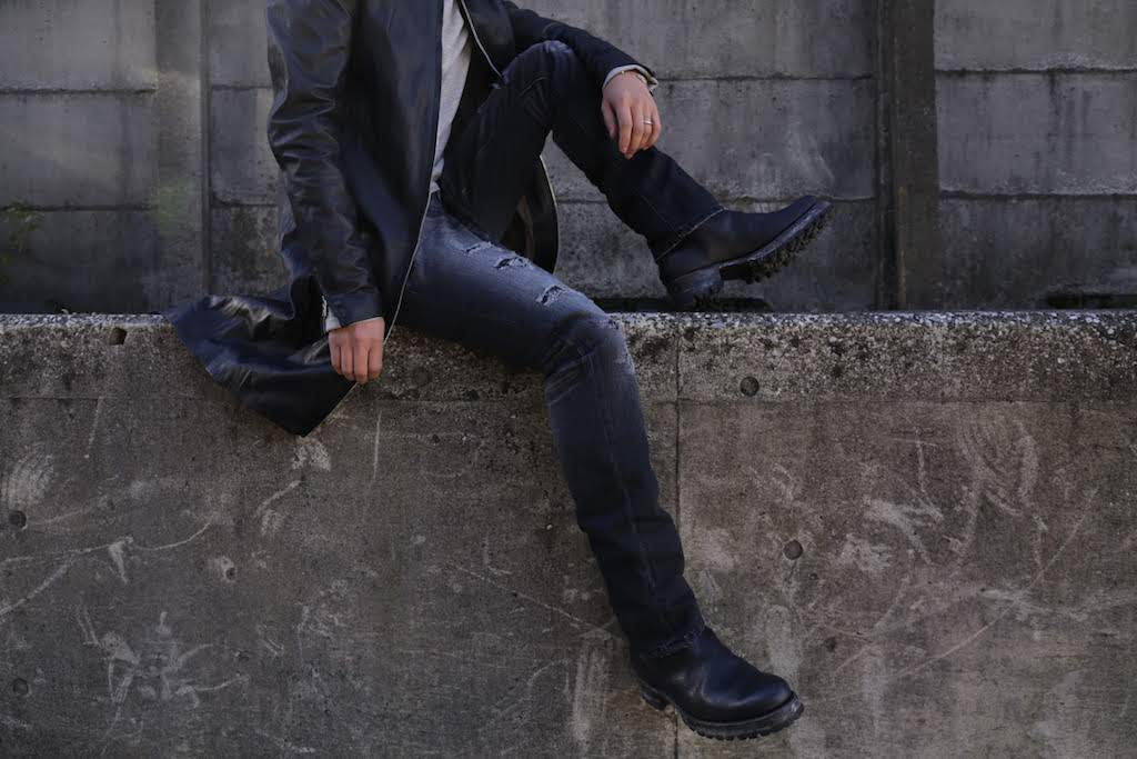 スリムシルエットフォルムとなるがブーツのシャフトが入る構築となっている為無骨でヤレたスタイリングを作り上げることが可能。