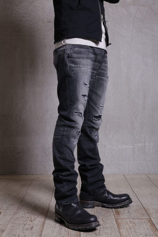 サイドシームがありながらも大きく湾曲させたガニ股の立体スタイルでタイトな膝下のフォルムながらも可動にとってはストレスを大きく軽減している。(もちろんそれは身生地に仕様したストレッチ性も加味している)最高のフォルムに熟練の職人が施すハンドシェービングならではのHW(ハードウォッシュ加工)の技法とさらにそこに生地の横糸のみを残すクラッシュ加工。また一度加工を施して完成させたのちにサイドシームを解体しBulletレザーを貼り付け、再度縫製をし直すという何十にも渡る工程を経てこのアルティメットデニムはこの世に生み落とされるのだ。