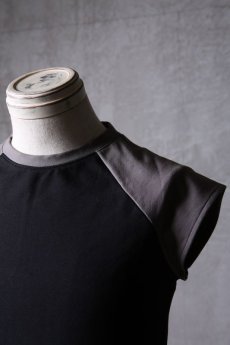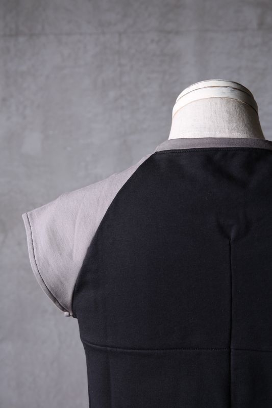 肩を露出するノースリーブデザインではなく、袖を少し残したデザインのフレンチスリーブ構築を取り入れたデザインとなり、このブランドらしい繊細さと無骨さを強く感じる作品となっている。