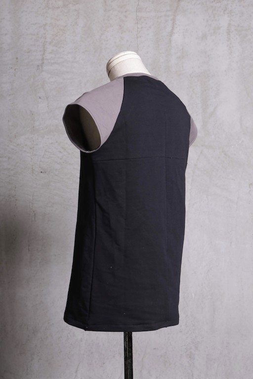 実際に着用することで腕回りが大きく露出し開放感のあるノースリーブらしい着用感を味わうことが出来、しかしショルダー部分を覆うような袖感となっているため、過度なワキの露出を抑え袖付きカットソー同様の着用が可能となる。