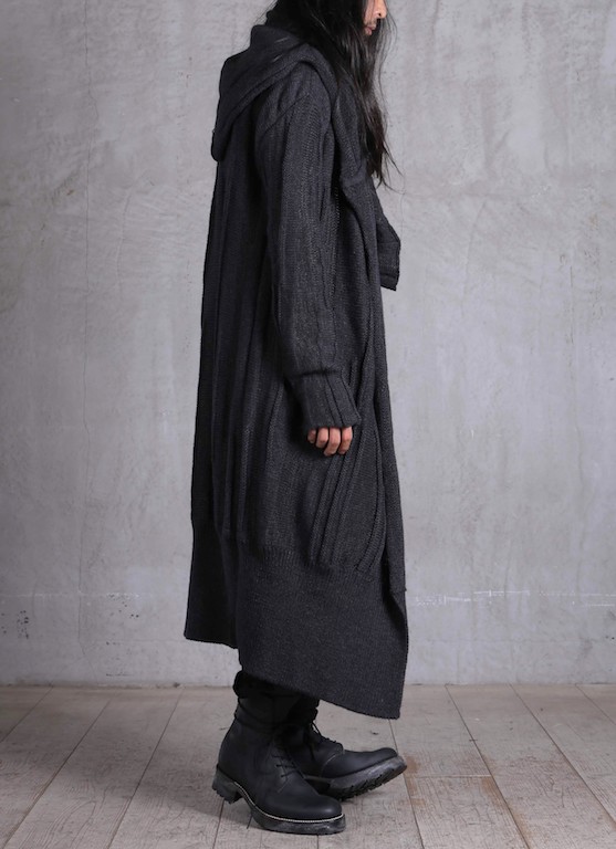 強烈に長い着丈で構築されたニットカーディガン/コート。