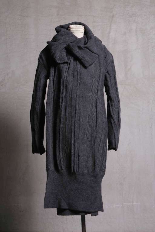 ランダムに、そして立体的に畝(うね)が入った複雑で難解な作り込みの編み込みで構築されたニットとなっており、ルーズフィットなシルエットデザインで構築されている。