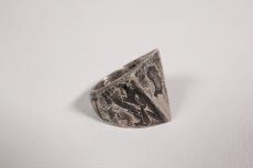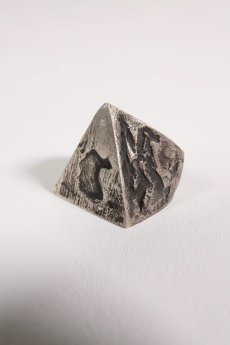 まるで鉄塊のような重厚感を放ち、強烈な存在感を感じさせるトライアングルモチーフの指輪。
