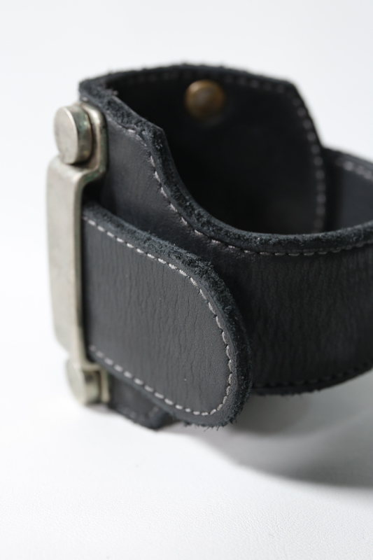 春夏のシンプルになりがちともなるスタイリングにおいてアクセサリーはアクセント、味付けとして重要な位置付けを持つ。日常的に容易な着脱を考えたシンプルな構造を持ちながらも着用時のインパクトと鈍く光るバックルが目を惹くブレスレットとなる。