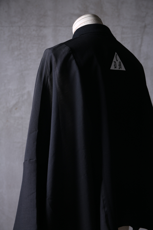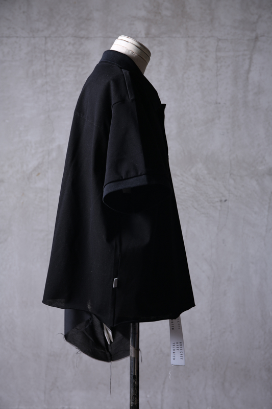 左右で非対称(アシンメトリー)に構築されたスリーブで半身でそのサイズ感も素材も違う。右半身はボディの中心と同じく鹿の子素材を使用した通常のスリーブで、左半身は落ち感のあるシャツ地を用いていてまるでポロシャツの肩に薄いストールのようなものを掛けているように見えるデザイン。