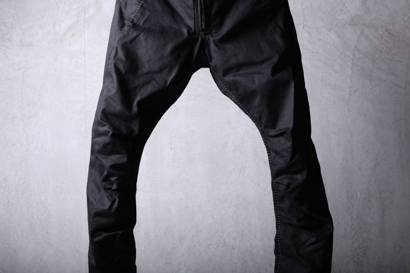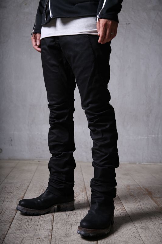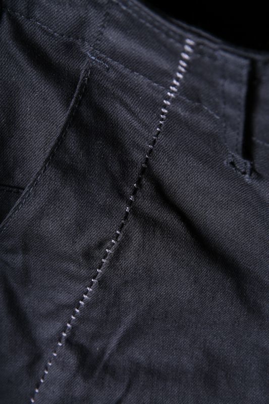 ワタリ(モモ幅)には意図的に余裕をもたせながらも、膝から裾に掛けては流れるような曲線でのシャープなライン。ねじれ(スパイラル)を持つ独特で完全独自のシルエットは他とは一線を画す。