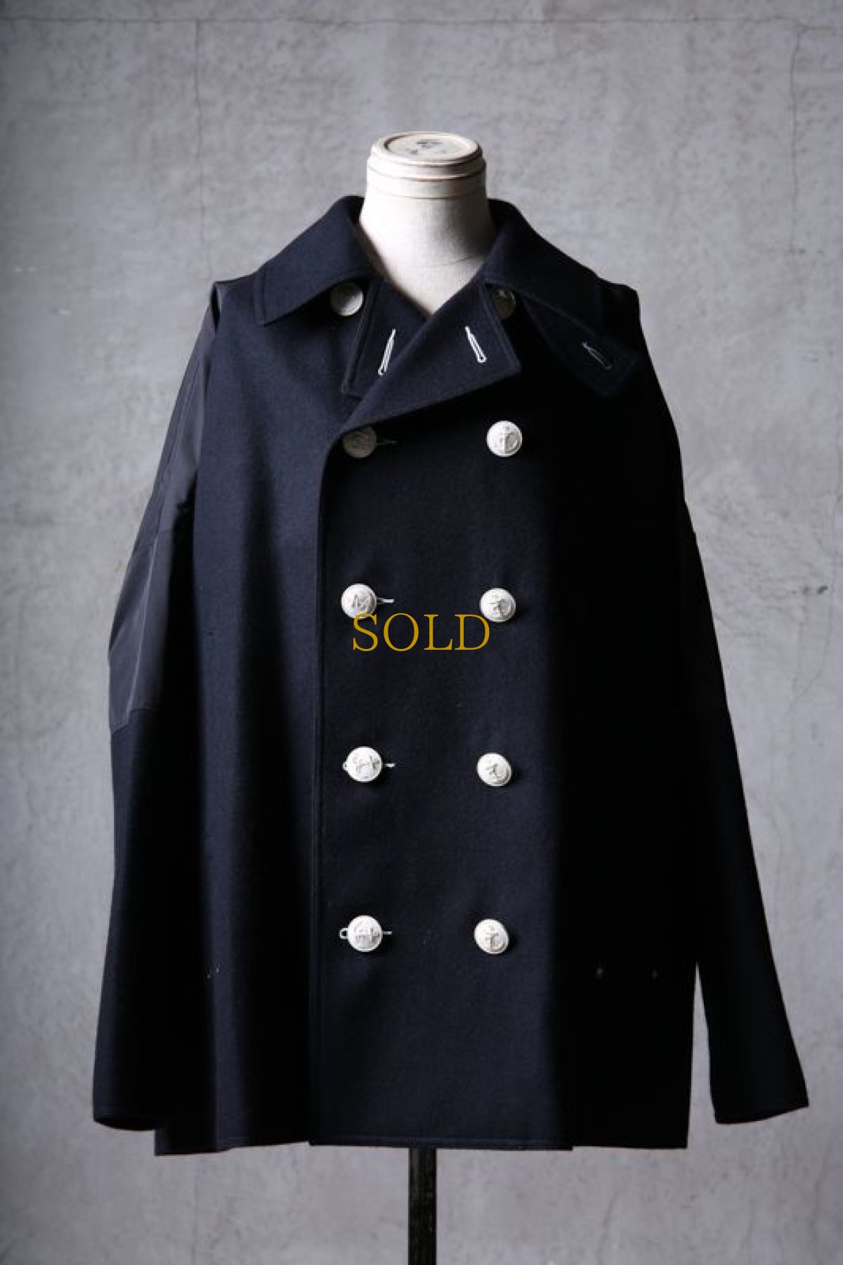 肉厚で重厚なメルトンはまさしくPコートらしい佇まいでありながらも、肩からアームにかけては別布(ナイロン調エステル)で切り替えることでデザインの中で大きく目を引くポイントに置いている。