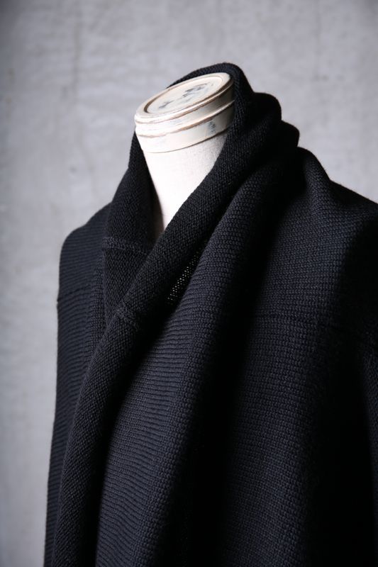 レーヨンが混紡されていることで糸に重み、落ち感が生まれその落ち感を生かしてのフロントにはボタン留めもなくダブル合わせ以上のカッティングを作ってそのドレープで合わせるというある種異次元的なデザインフォルムとなっています。