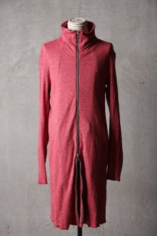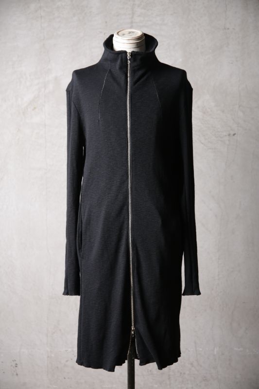フルレングスに近いニットコートは1枚での着用でも大きな演出力を持っている それでいて、インナーとしてもレイヤードスタイルで得も言われぬ存在感を生み出すのが大きな特徴で特にこの着丈の長さは稀有な存在でもありロング丈との合わせやミドル丈での合わせでも裾から覗くカラーレイヤードなどで特徴的なスタイル演出が出来るのが魅力的 ディストーションネックやハーヴェストスリーブ構造など見どころの多いアイテムでもある