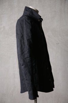 脇下を1枚続きとなっているハーヴェストスリーブ構造、フロントデザインはジップでの開閉に加えて比翼仕立てのボタン留めとなりその両方を表に出さないデザインは実のところ縫製工程を大きく増やすこととはなるがデザインの無機質性に寄与している。袖口も同様に本開き構造を意図的に比翼仕立てにすることでパーツを一切表に出さない。ZIPでの脱着構造ライナーによりシーズンの幅も広く設定した。