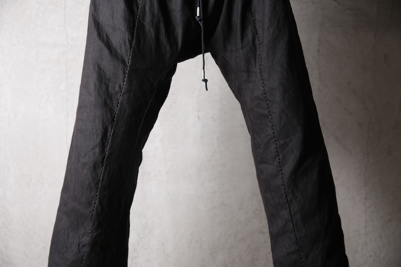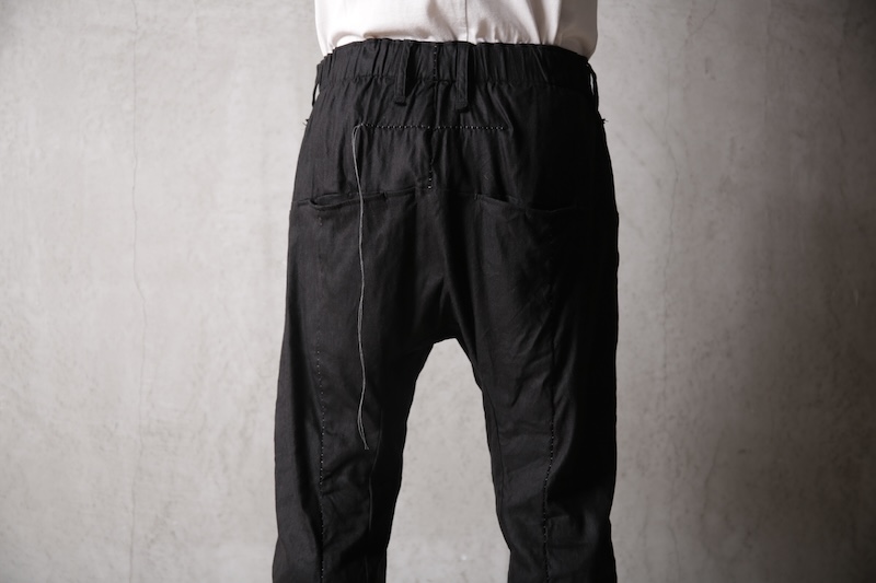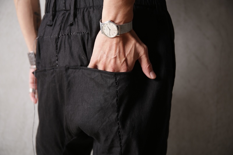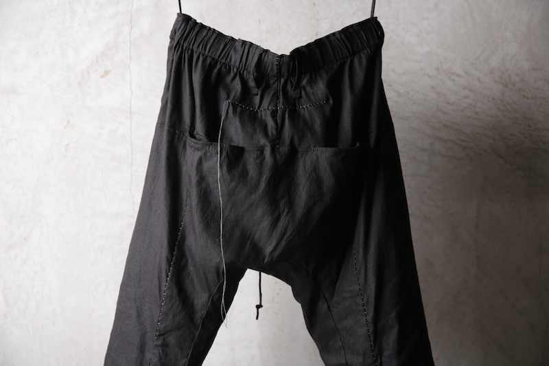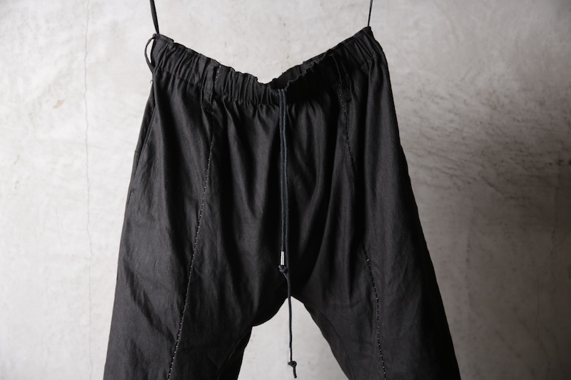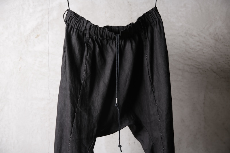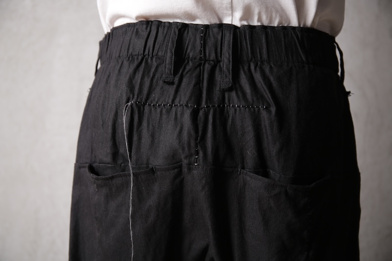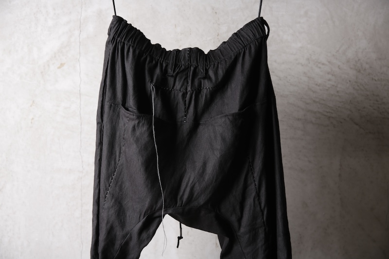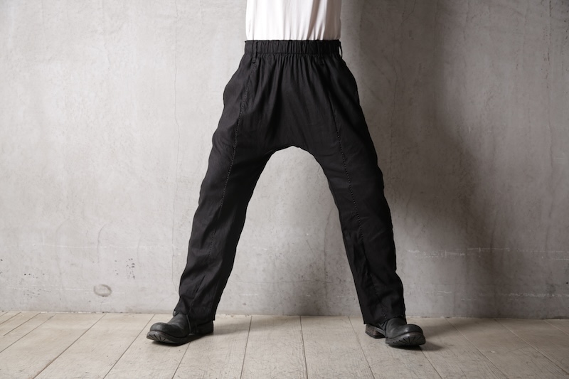 通常はマチとして股下のみにガゼットを配するサルエルパンツの構造を股下から一枚ハギの構造を持たせることでこの独特のドレープ的サルエルパンツのシルエットラインに構築されている