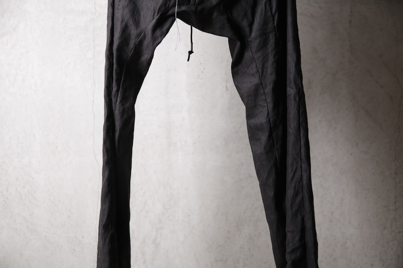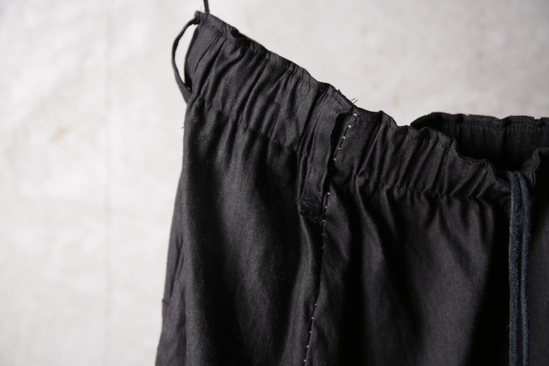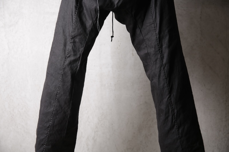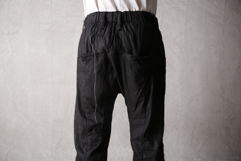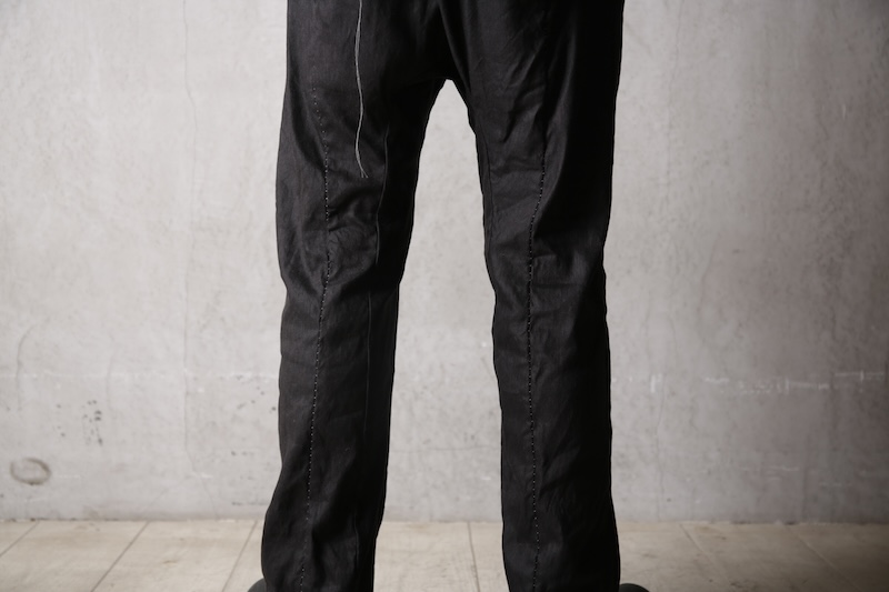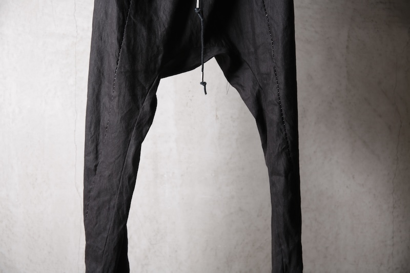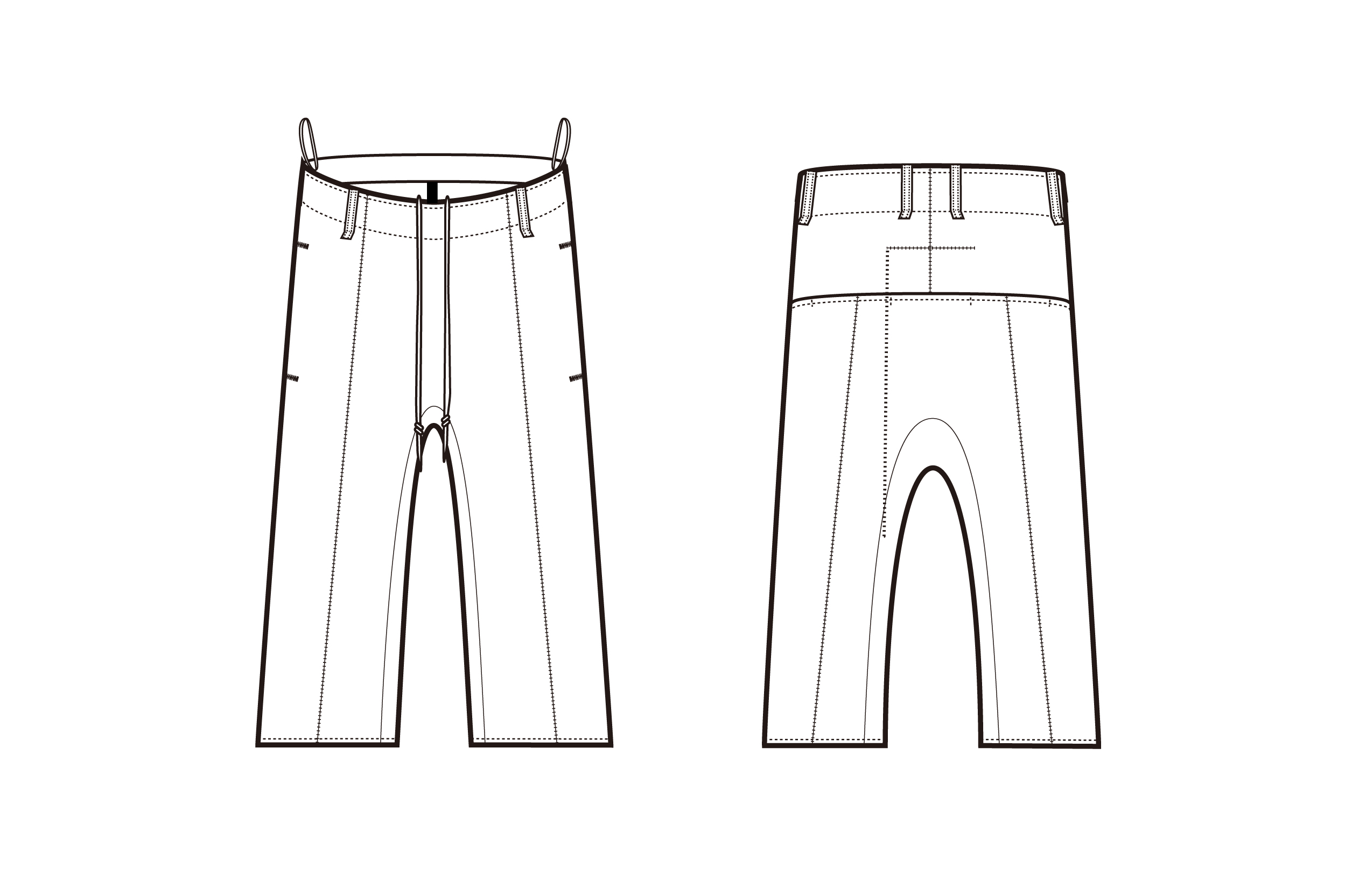 通常はマチとして股下のみにガゼットを配するサルエルパンツの構造を股下から一枚ハギの構造を持たせることでこの独特のドレープ的サルエルパンツのシルエットラインに構築されている