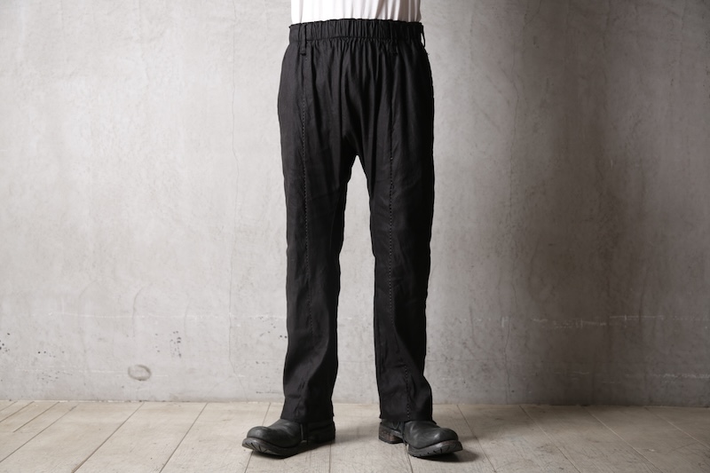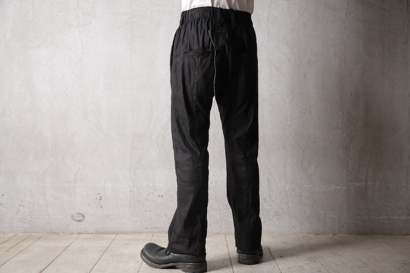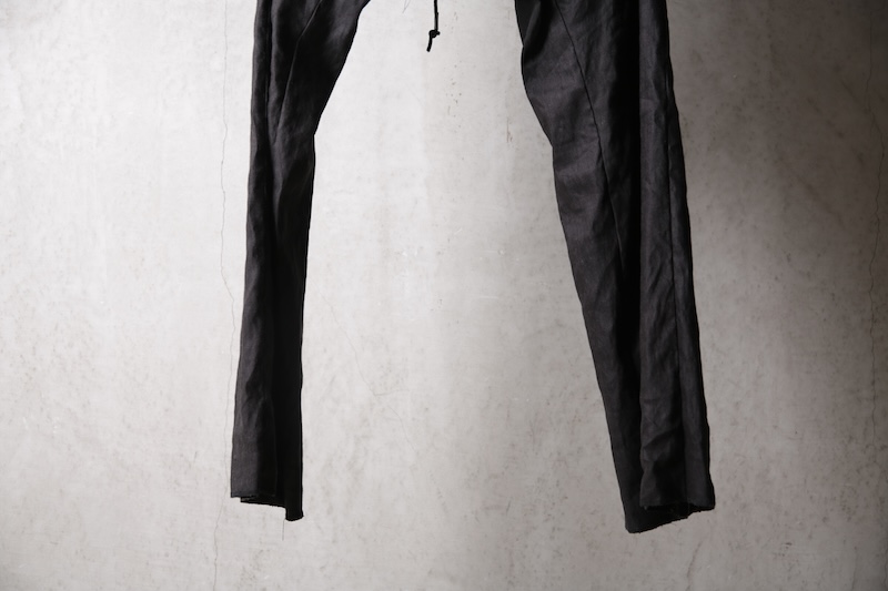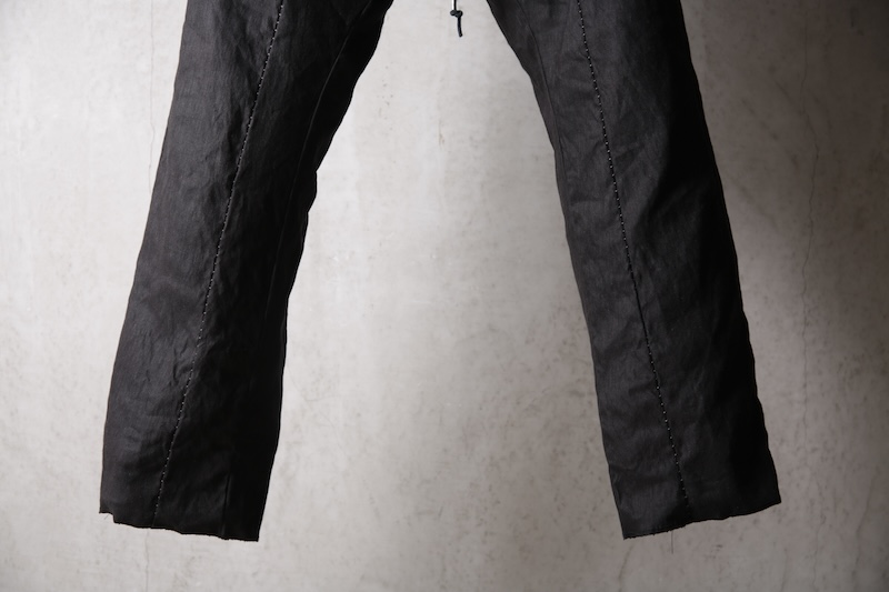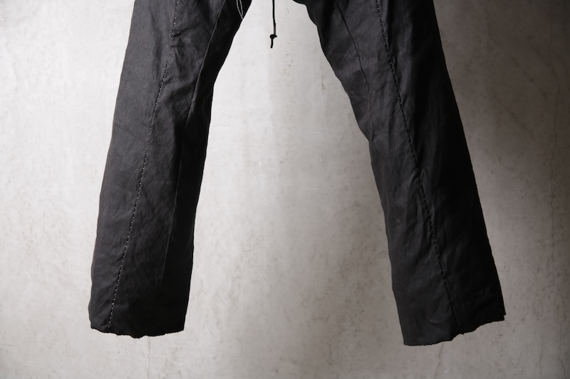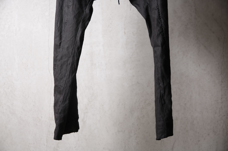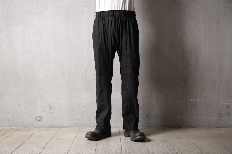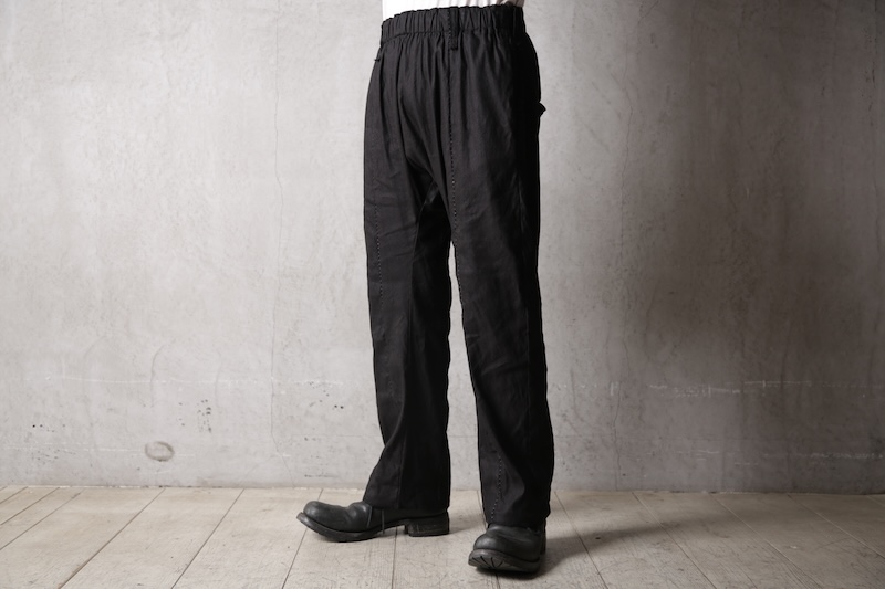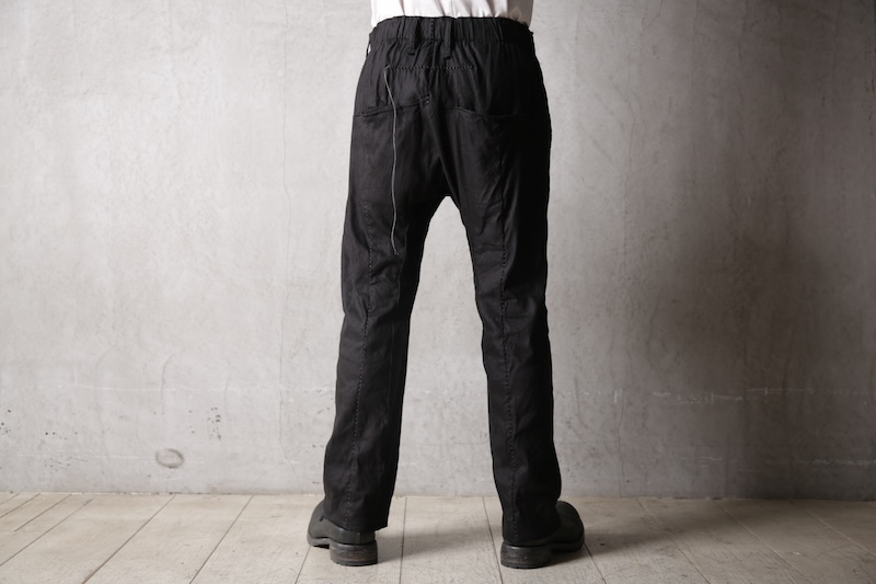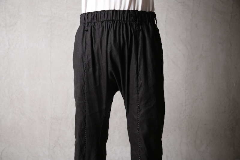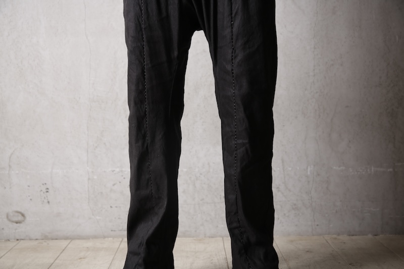 通常のサルエルパンツとは一線を画すフロント、バック共にセンター部分で分割されたデザインワークにより生み出される立体的なシルエットが構築されておりそのために生まれる全体のドレープ感は単なるルーズイメージに偏りがちなサルエルパンツの概念すらも意にかえさない。
