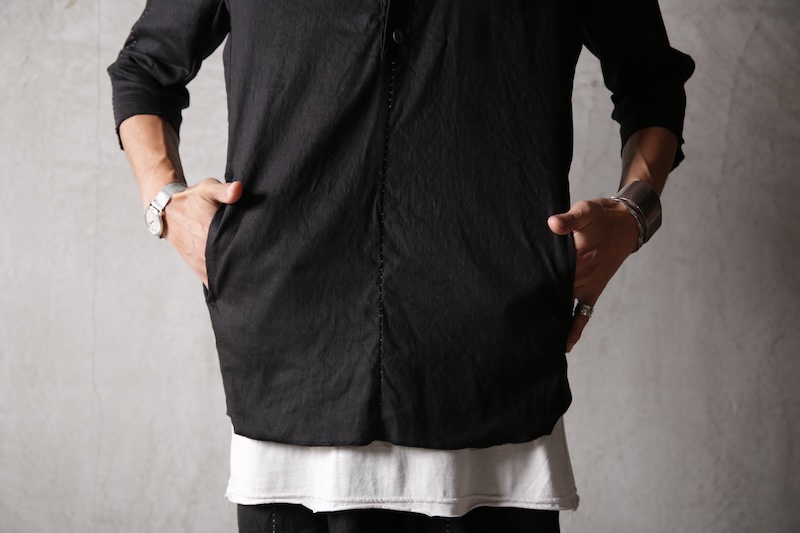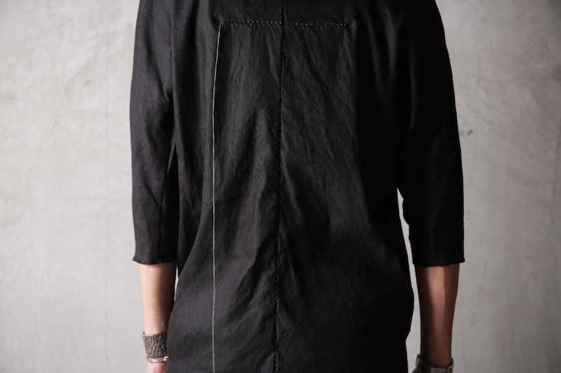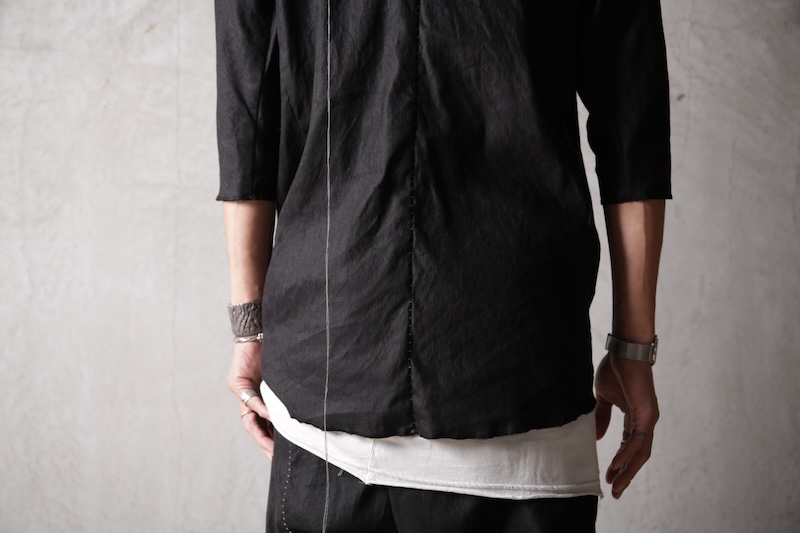Tシャツ型でありながらも布帛用のパターンメイクを施すことにより機能性としてもサイドスリットポケット(左右1枚続きの構造もまた見どころ)が配されているのが特徴的だ