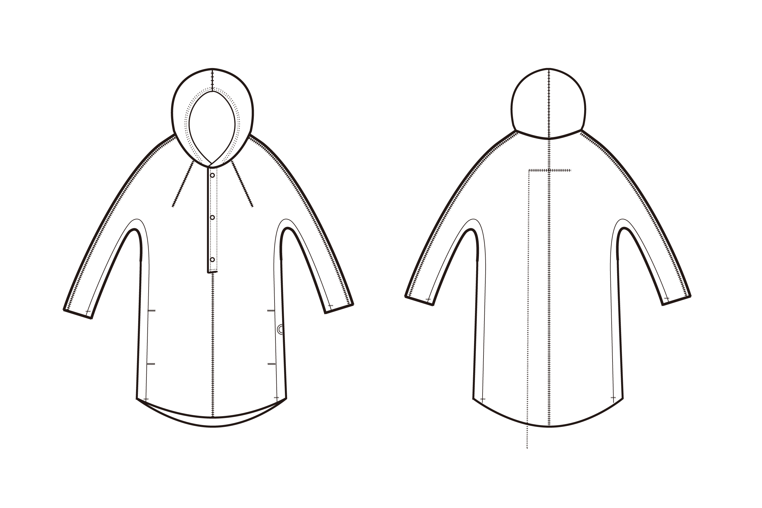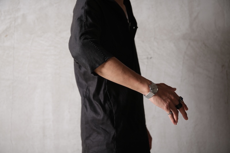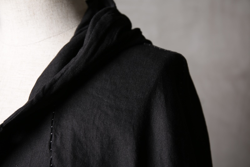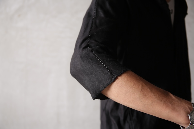 脇下を一枚ハギの構造を持たせることで本来構造的に必須と言われるアームホール構造を持たずに布帛では通常ありえないドルマンスリーブ的な立体構造を作り出します