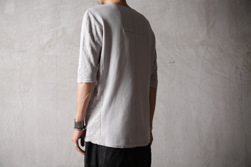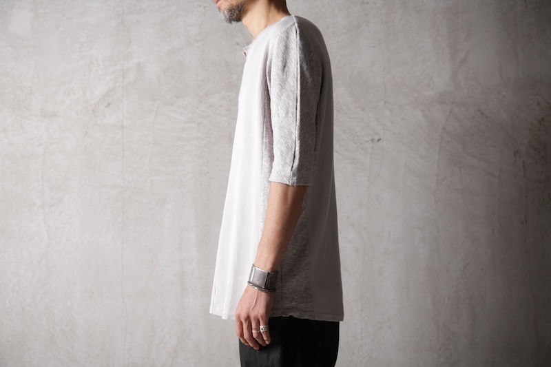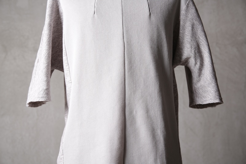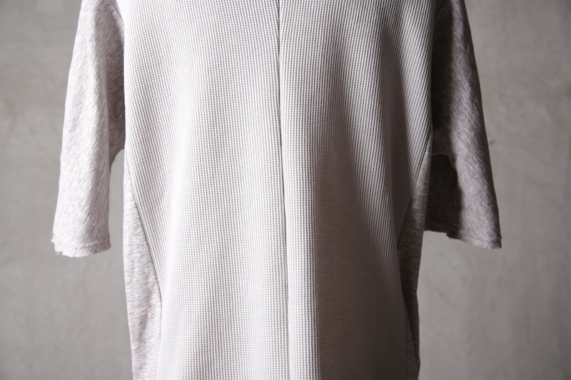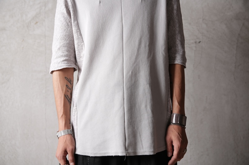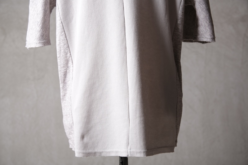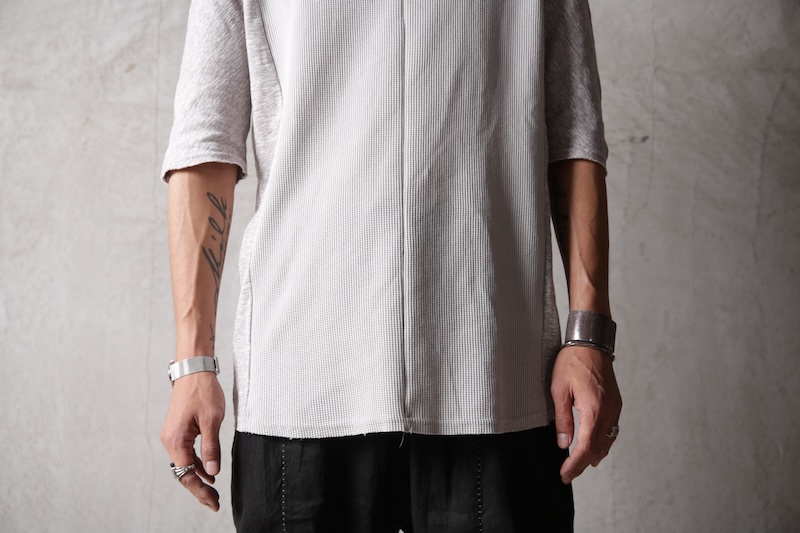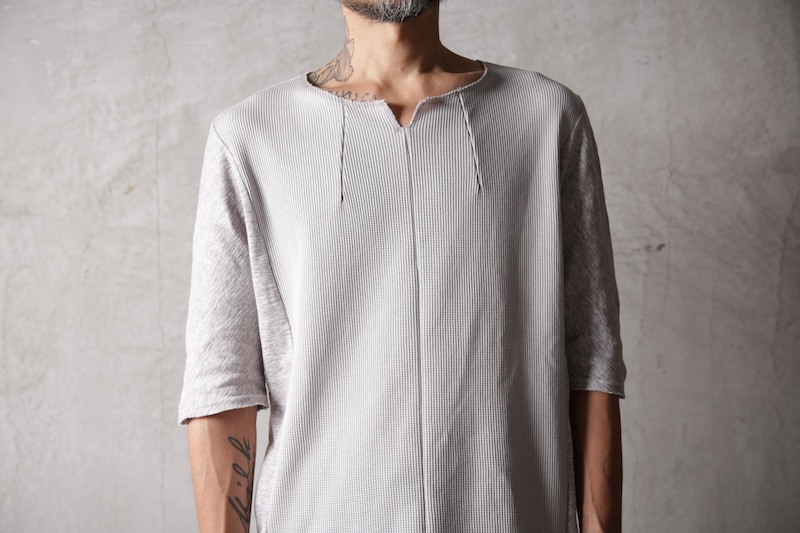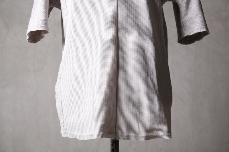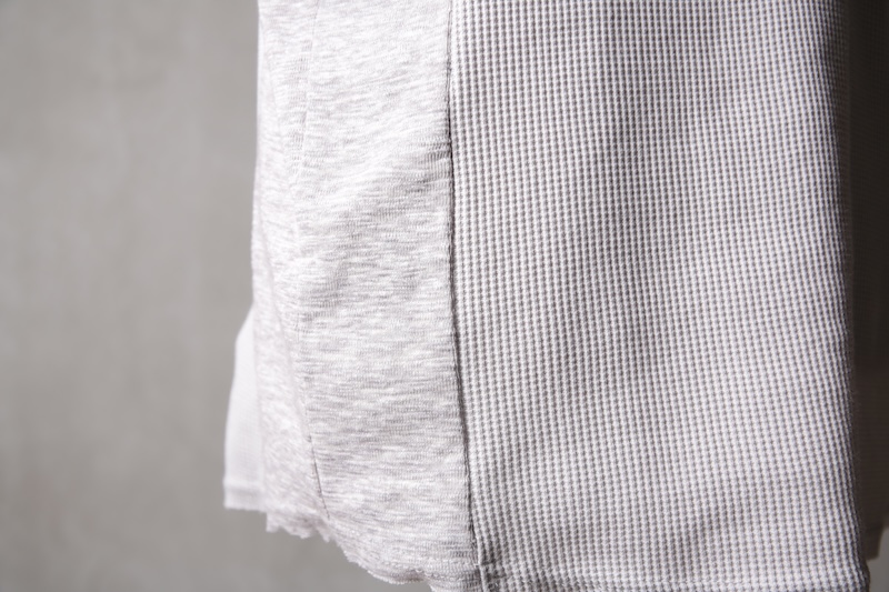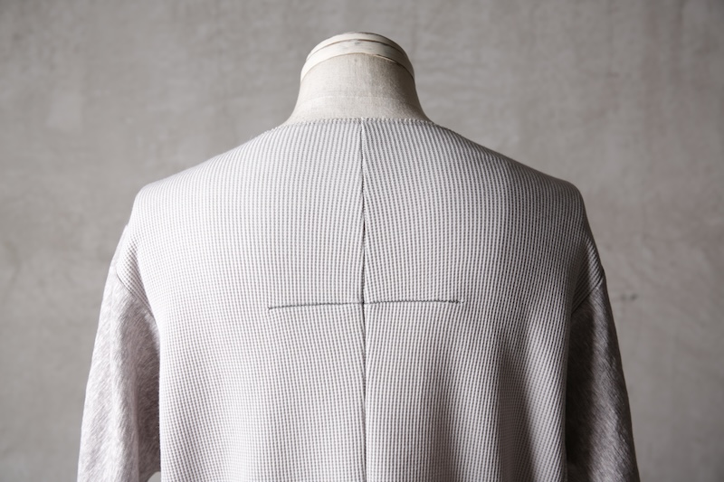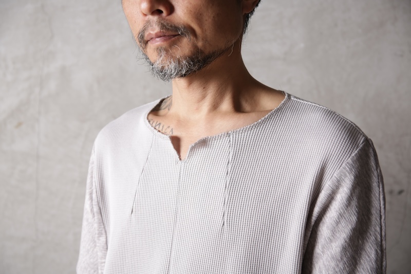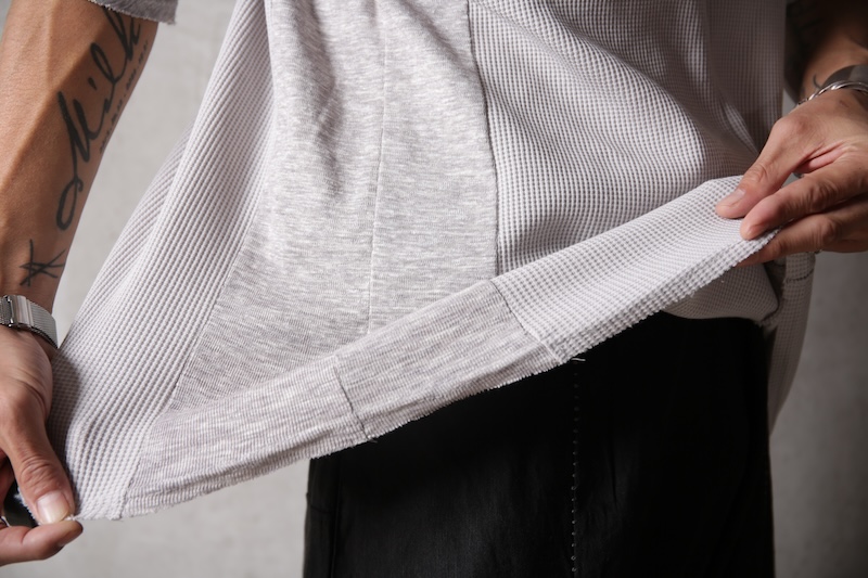 ワッフル、サーマルとは生地の表面に凹凸の編みを作り出すことで通常の天竺編み等に比べて糸を多く使いその糸分量によって防寒性が生まれながらも夏場には速乾性を持たせている。主にインナーカットソーの素材として多く用いられる。コットン100%であると凹凸によっての強い撚れの為に生地に捻じれなどが生まれて型崩れが強くなる為コットンに織り交ぜてエステルを1/4程度混紡させることでその撚れを防止して型崩れを食い止める素材を作り出した。生地の凹凸が生み出す自然な伸縮性は着心地が非常に良く、また当然ながら防寒性も高めてくれる。型崩れのしずらさや耐久性、素材の普遍性などの実績のある素材を選び抜いている。フラットな表情と一味違うワッフルの凹凸があるため異素材とのレイヤードで同色(ブラックとブラックの掛け合わせなど)との組み合わせでも表情感の違いを演出することが出来る。