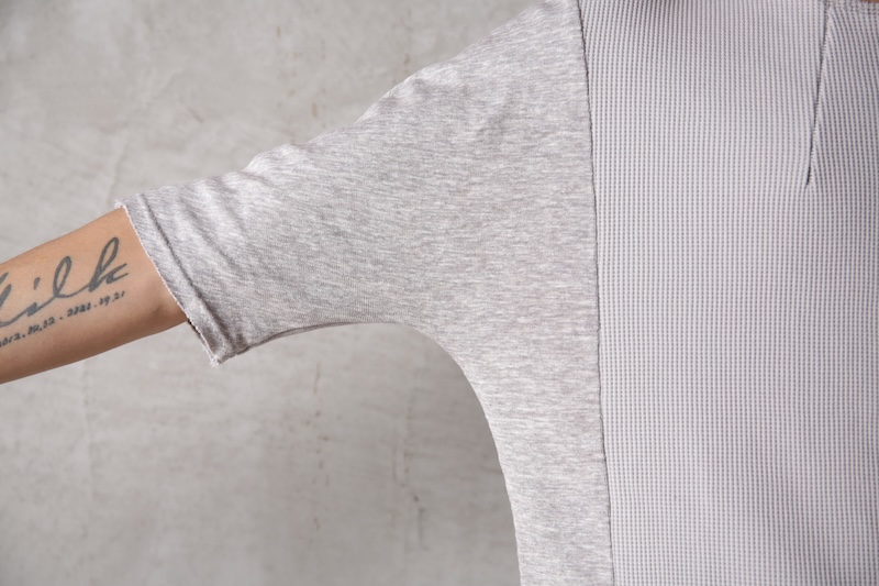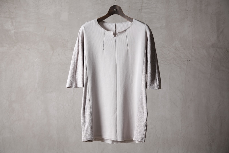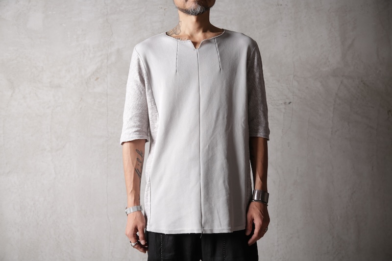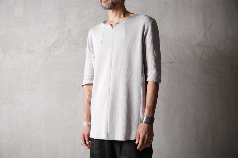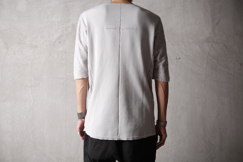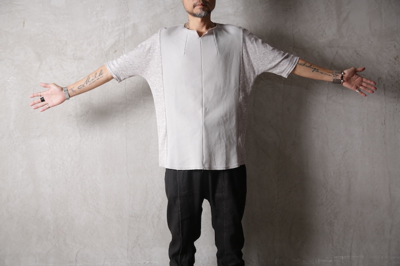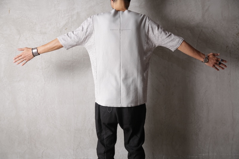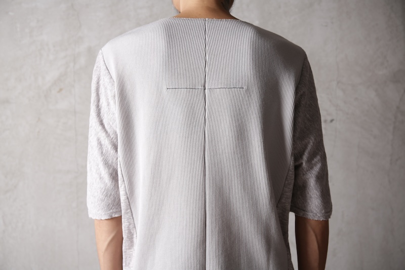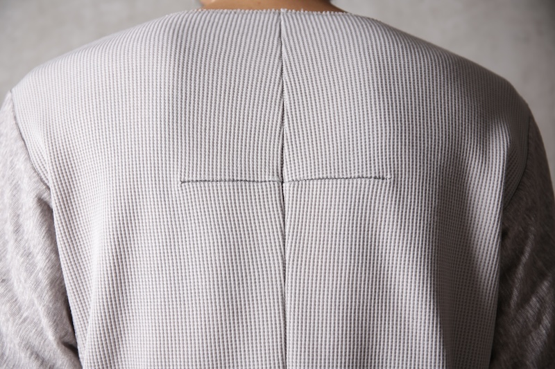 縦方向に無限に広がる切り返しにより身頃と袖側で生地の方向性を意図的に変化させることでより立体的な仕上がりとなっている。キーネック的にスリットが入ったネック具合などが大きな見どころである。
