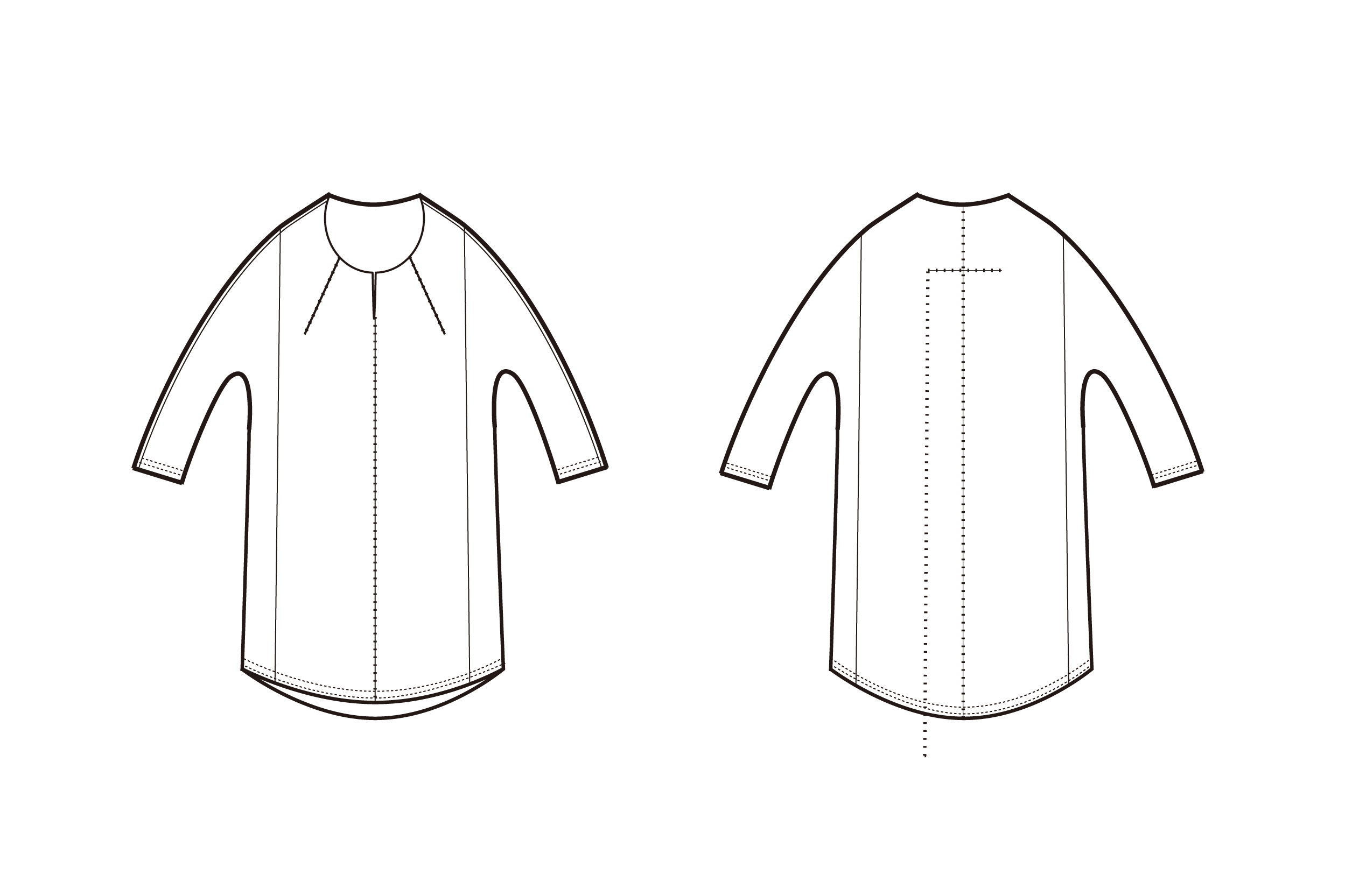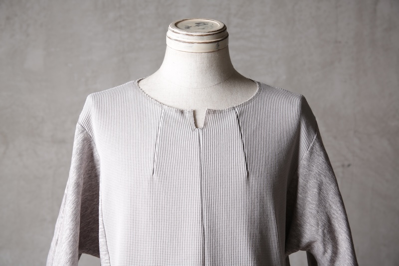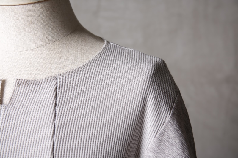 意図的にバインダー処理を行わずにまた付属生地も用いずにネック部分や裾を水平フラット構造にしているのは全体に生地が美しく垂れ下がる方向性能を意識したもの。