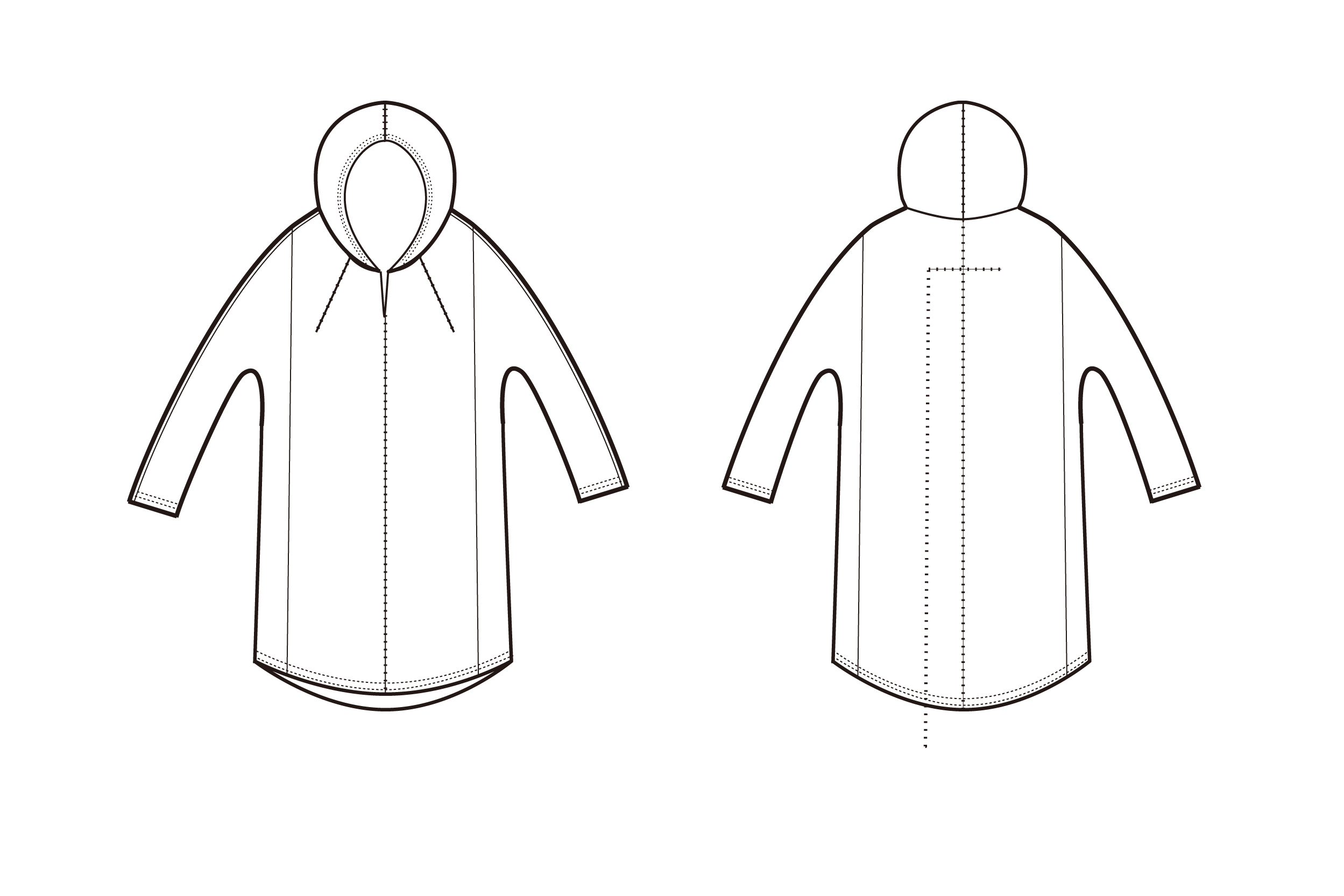 通常は存在するアームホールを意図的に廃してドルマンスリーブの構造となっておりセンター分割と袖山にシームを配するすることでアームの立体性能を損なわずスリーブラインが構築されている。