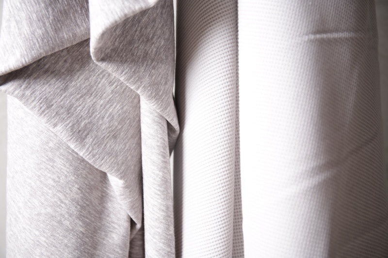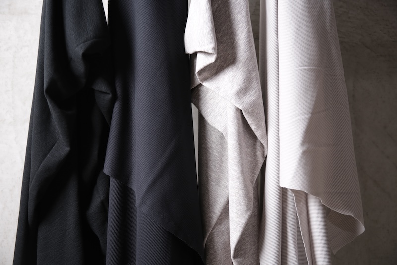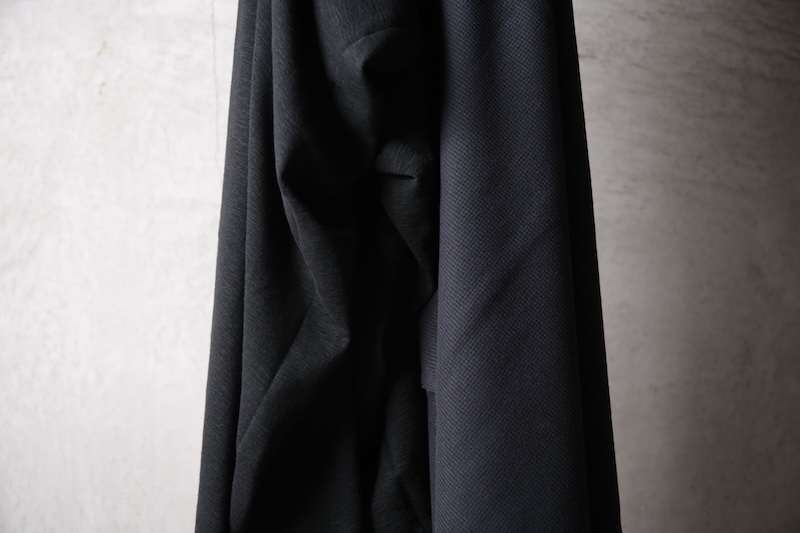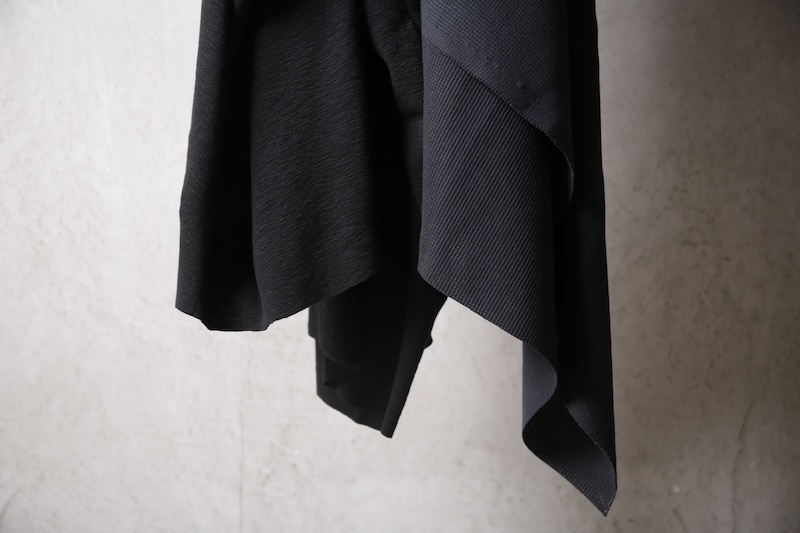 意図的にバインダー処理を行わずにまた付属生地も用いずにネック部分や裾を水平フラット構造にしているのは全体に生地が美しく垂れ下がる方向性能を意識したもの。