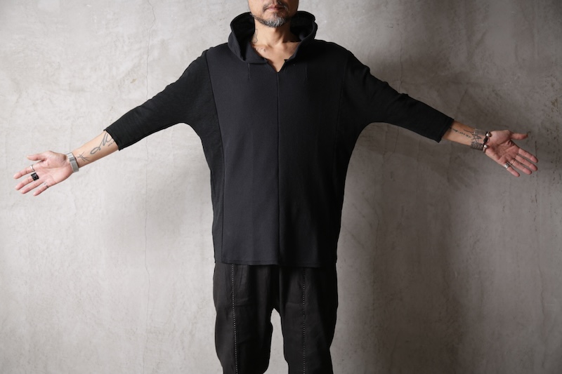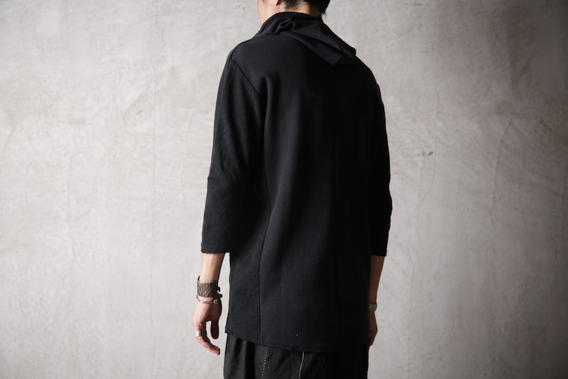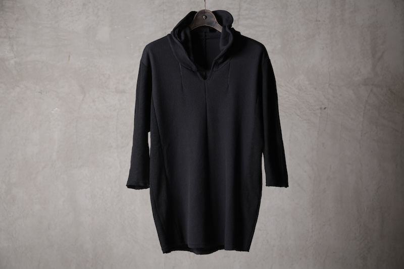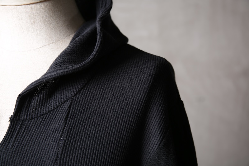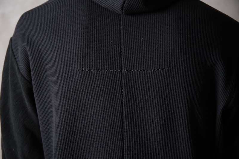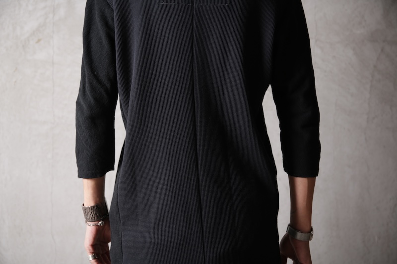縦方向に無限に広がる切り返しにより身頃と袖側で生地の方向性を意図的に変化させることでより立体的な仕上がりとなっている。キーネック的にスリットが入ったネック具合などが大きな見どころである。