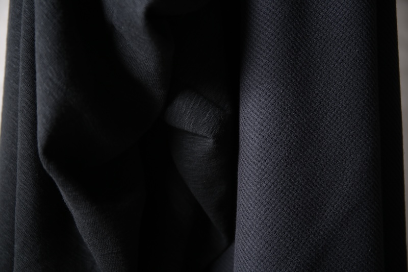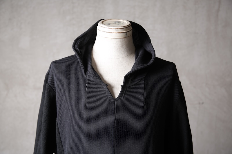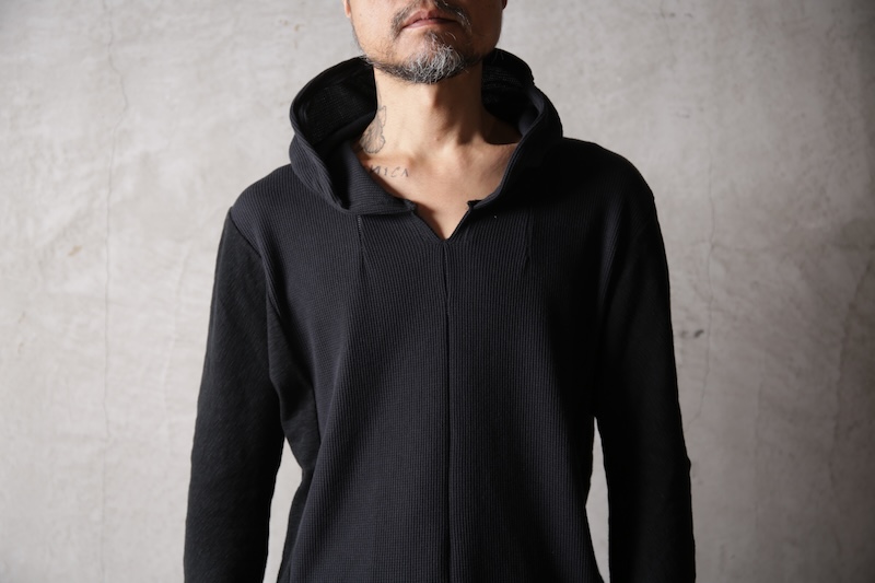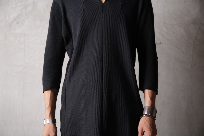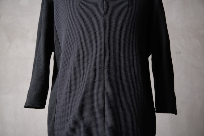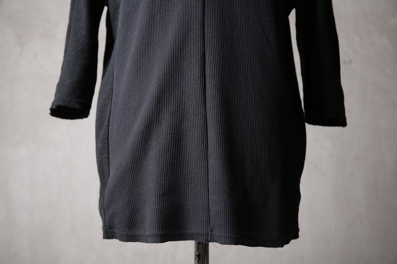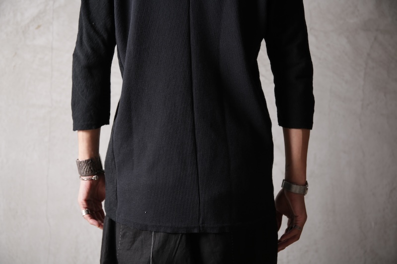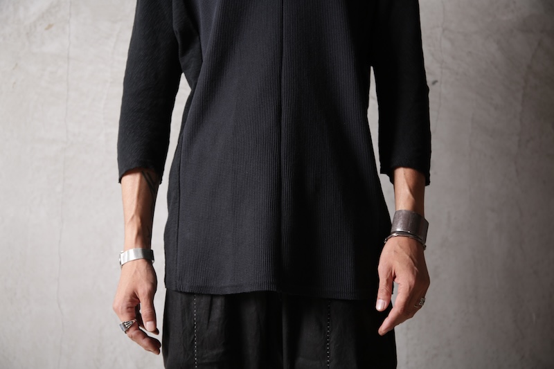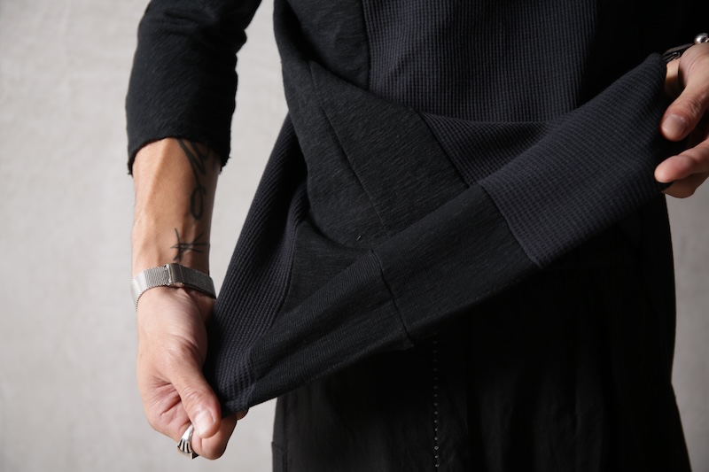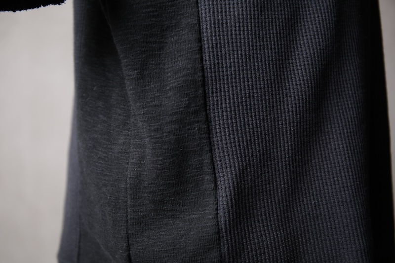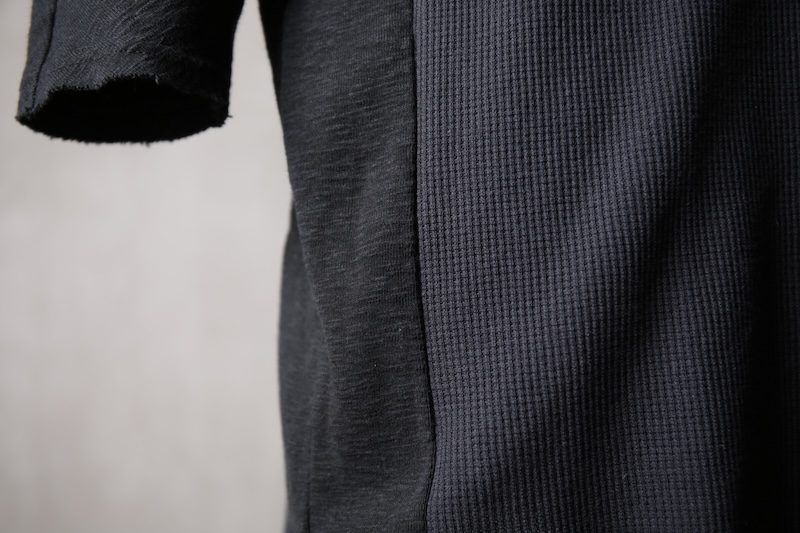 ワッフル、サーマルとは生地の表面に凹凸の編みを作り出すことで通常の天竺編み等に比べて糸を多く使いその糸分量によって防寒性が生まれながらも夏場には速乾性を持たせている。主にインナーカットソーの素材として多く用いられる。コットン100%であると凹凸によっての強い撚れの為に生地に捻じれなどが生まれて型崩れが強くなる為コットンに織り交ぜてエステルを1/4程度混紡させることでその撚れを防止して型崩れを食い止める素材を作り出した。生地の凹凸が生み出す自然な伸縮性は着心地が非常に良く、また当然ながら防寒性も高めてくれる。型崩れのしずらさや耐久性、素材の普遍性などの実績のある素材を選び抜いている。フラットな表情と一味違うワッフルの凹凸があるため異素材とのレイヤードで同色(ブラックとブラックの掛け合わせなど)との組み合わせでも表情感の違いを演出することが出来る。