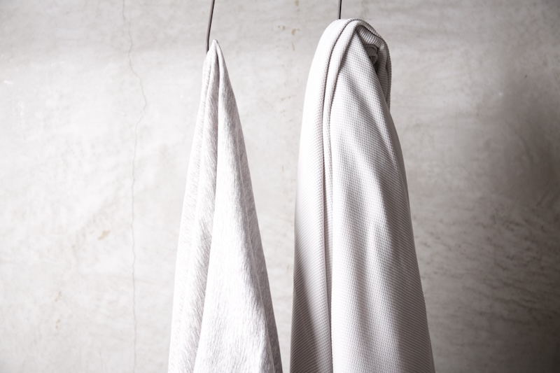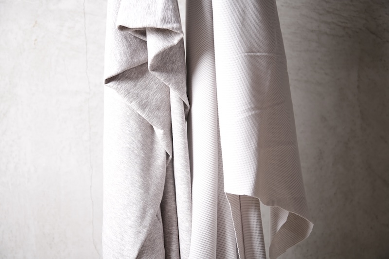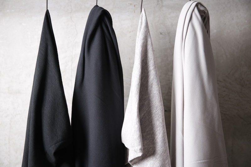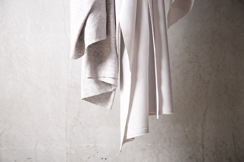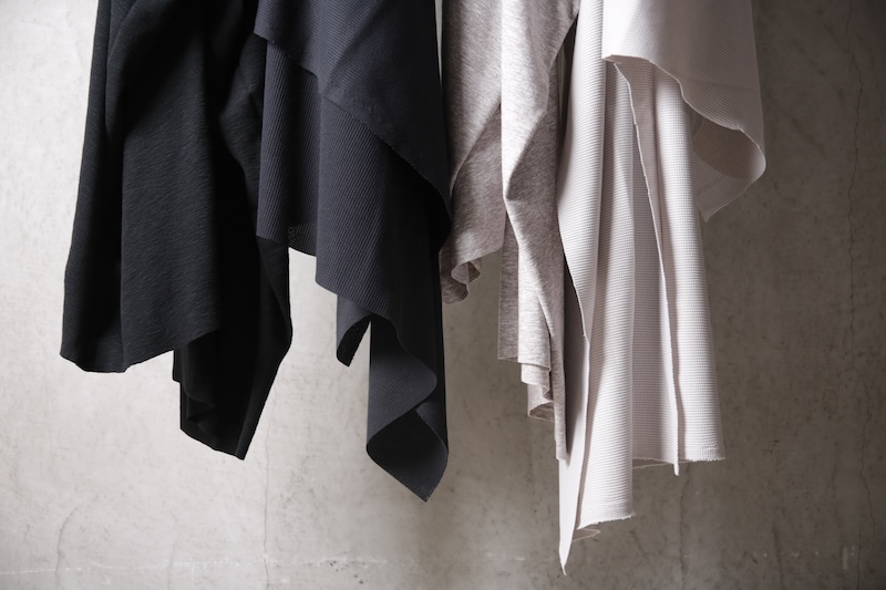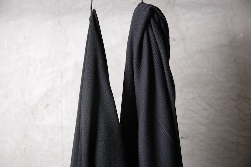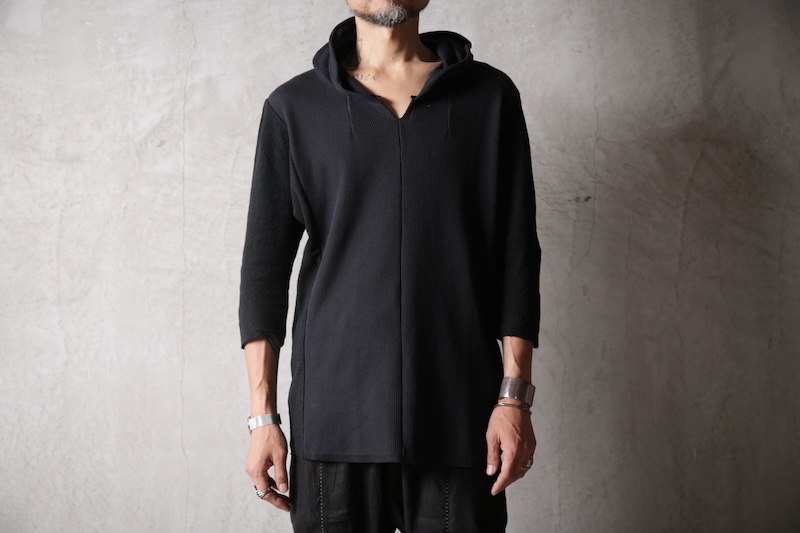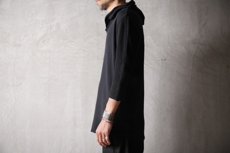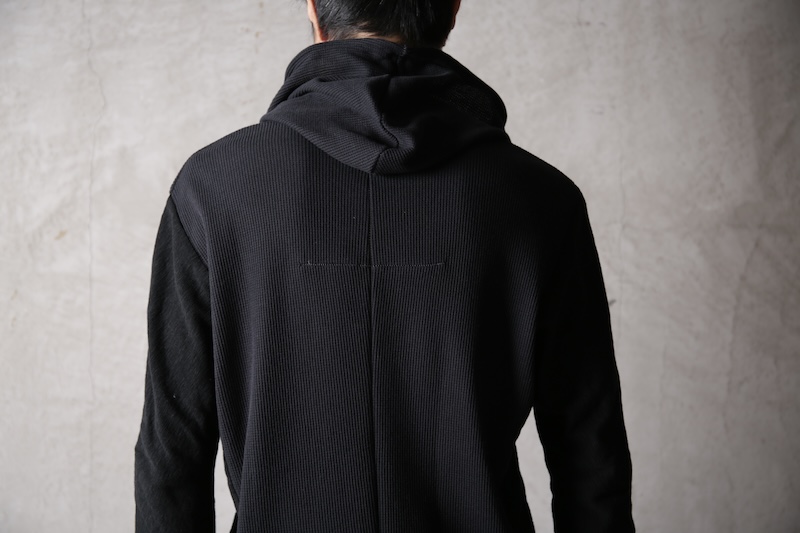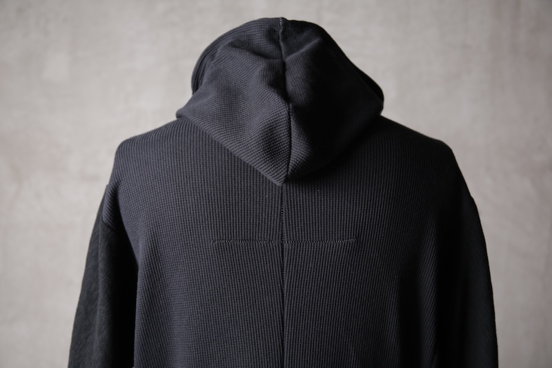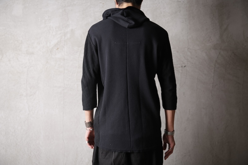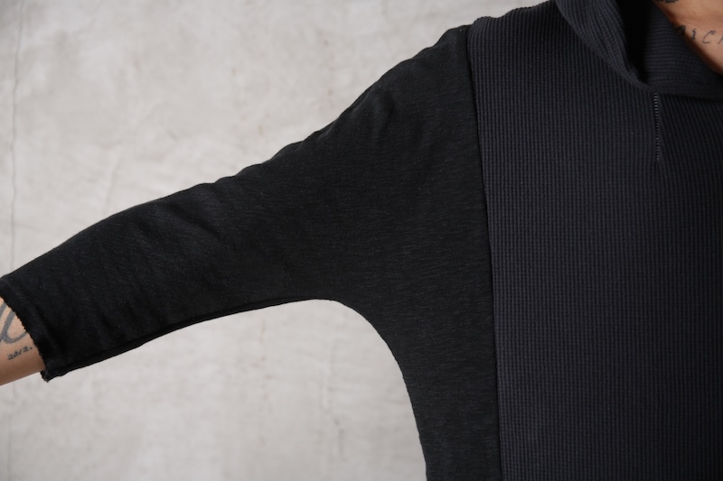 ワッフル、サーマルとは生地の表面に凹凸の編みを作り出すことで通常の天竺編み等に比べて糸を多く使いその糸分量によって防寒性が生まれながらも夏場には速乾性を持たせている。主にインナーカットソーの素材として多く用いられる。コットン100%であると凹凸によっての強い撚れの為に生地に捻じれなどが生まれて型崩れが強くなる為コットンに織り交ぜてエステルを1/4程度混紡させることでその撚れを防止して型崩れを食い止める素材を作り出した。生地の凹凸が生み出す自然な伸縮性は着心地が非常に良く、また当然ながら防寒性も高めてくれる。型崩れのしずらさや耐久性、素材の普遍性などの実績のある素材を選び抜いている。フラットな表情と一味違うワッフルの凹凸があるため異素材とのレイヤードで同色(ブラックとブラックの掛け合わせなど)との組み合わせでも表情感の違いを演出することが出来る。