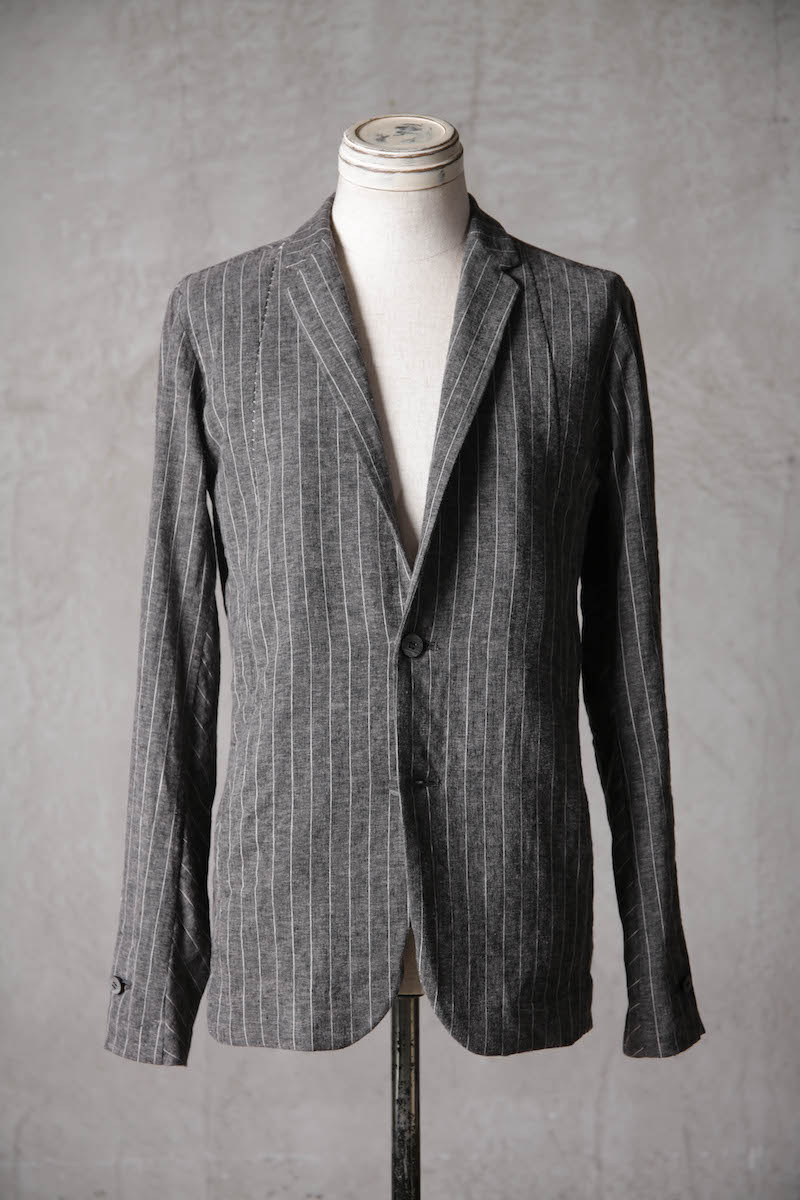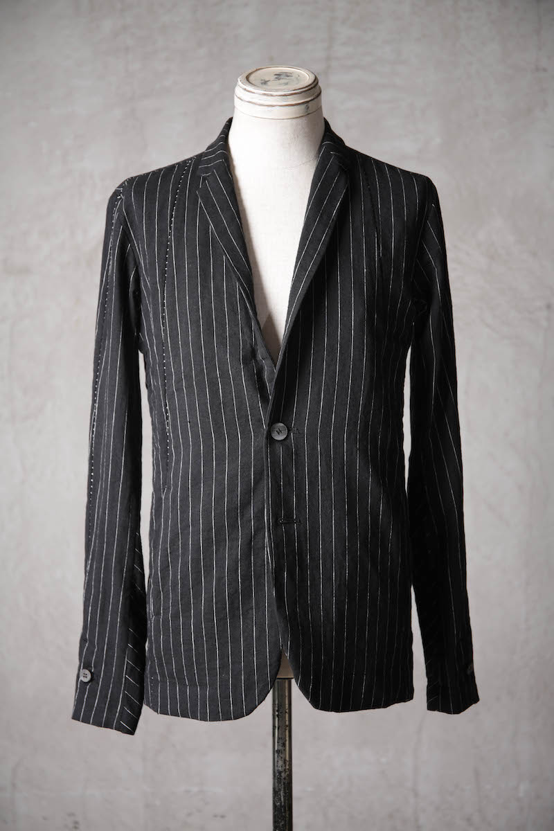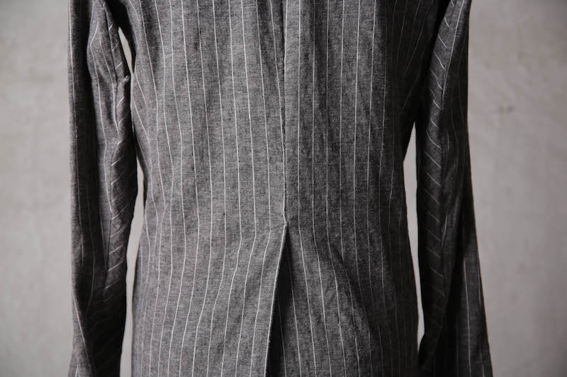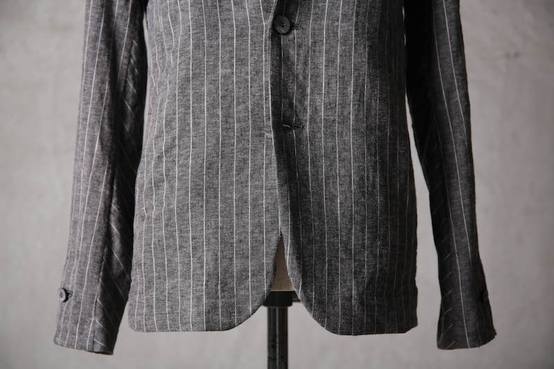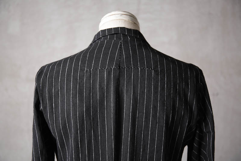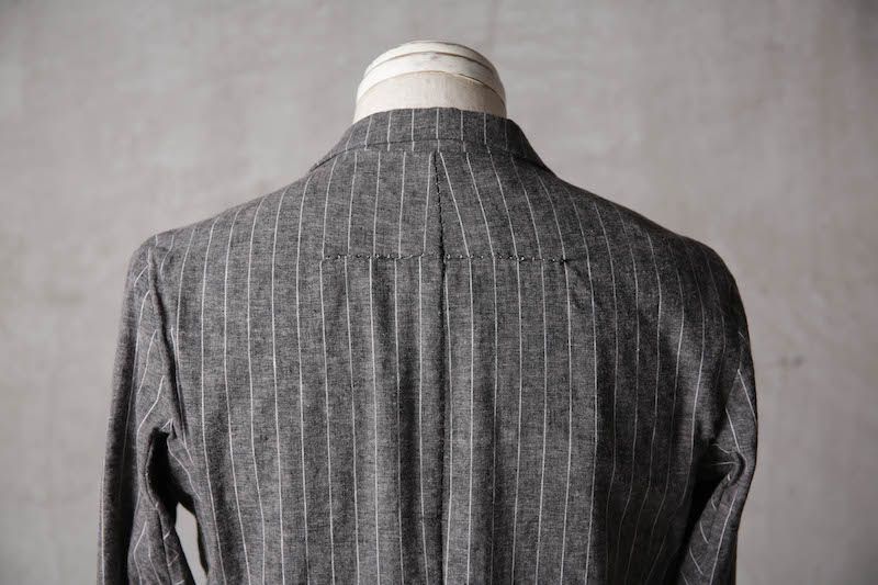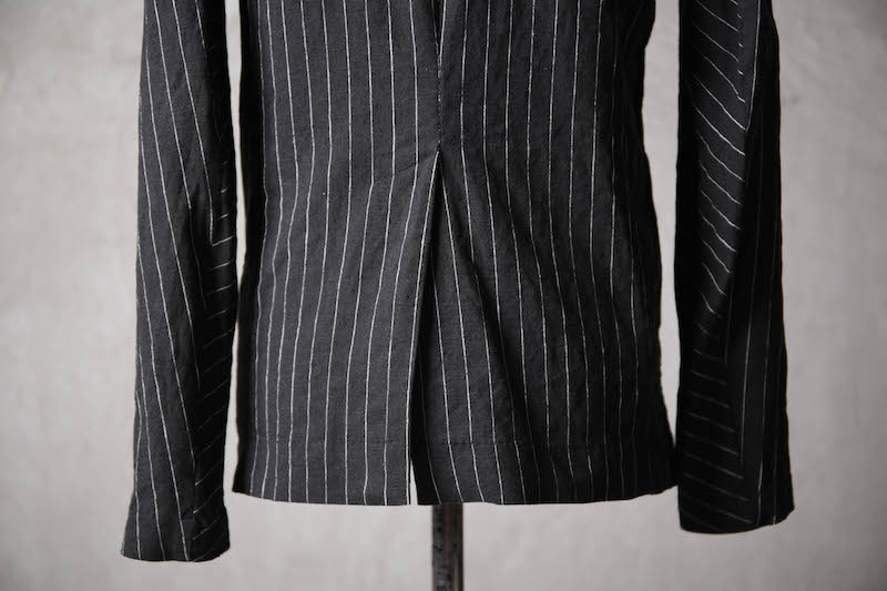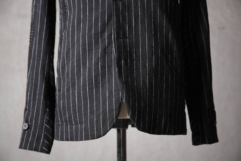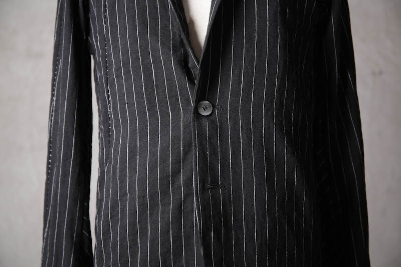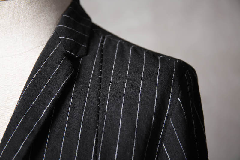 裏地のないモデルのためセンターベンツ、裾や袖口のステッチ処理を極限まで美しく魅せるために通常の叩きつけのステッチではなくルイスと呼ばれる特殊ミシンを使いステッチが目立たないような作りとしている。逆説的に各所にはステッチそのものがデザインともなるオーバーロックの処理をしてその相反する構造はジャケットに深く向き合ったデザイナーの意図である。