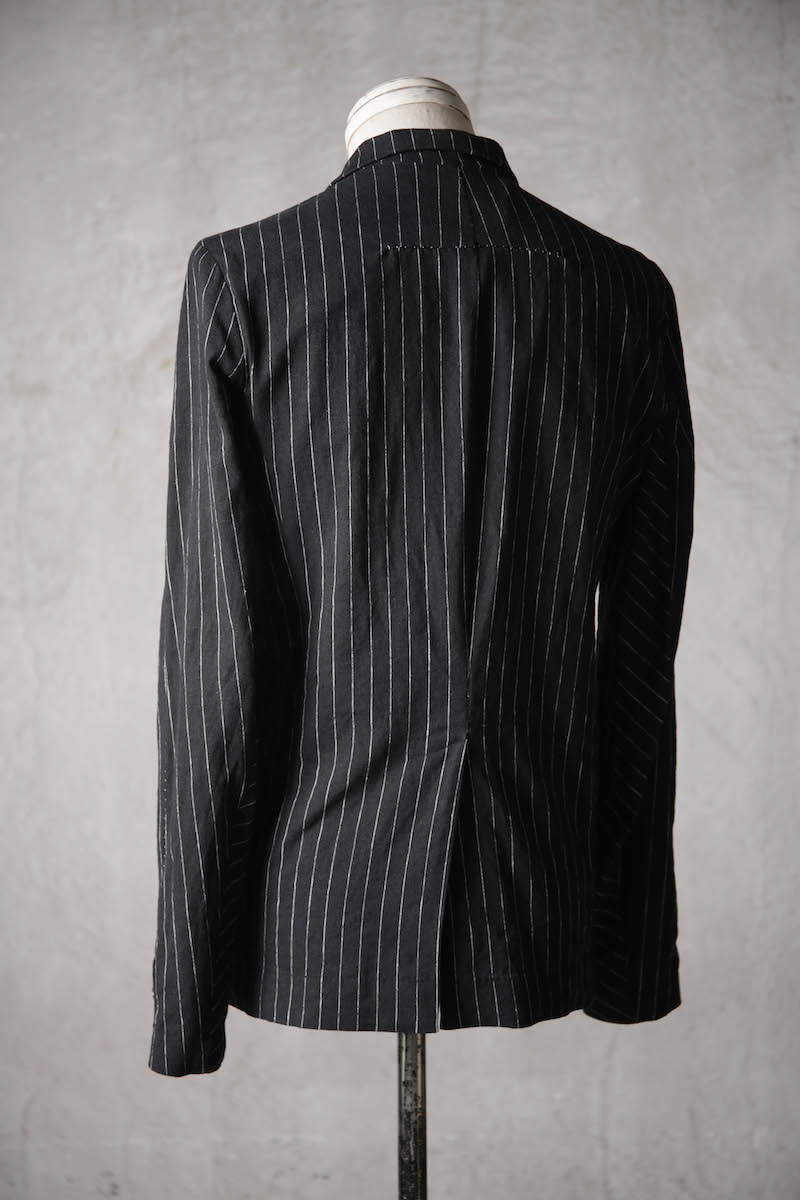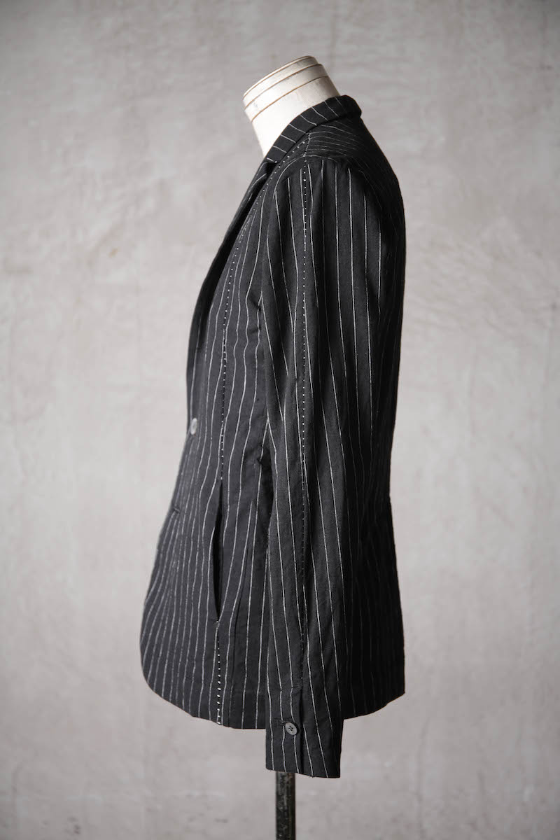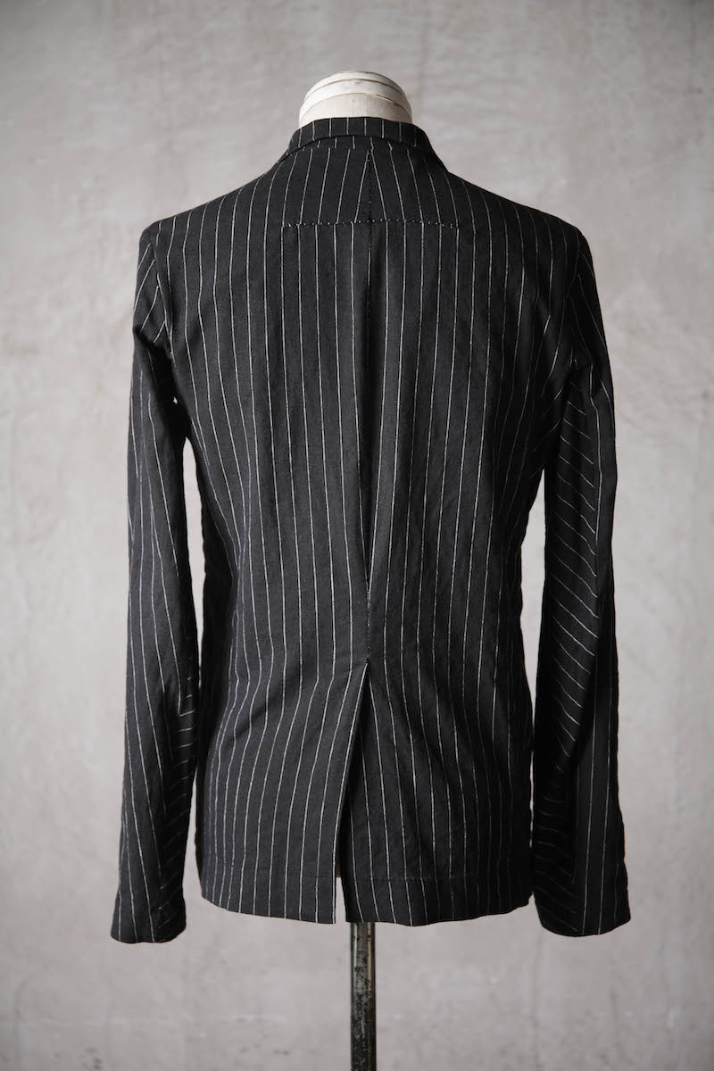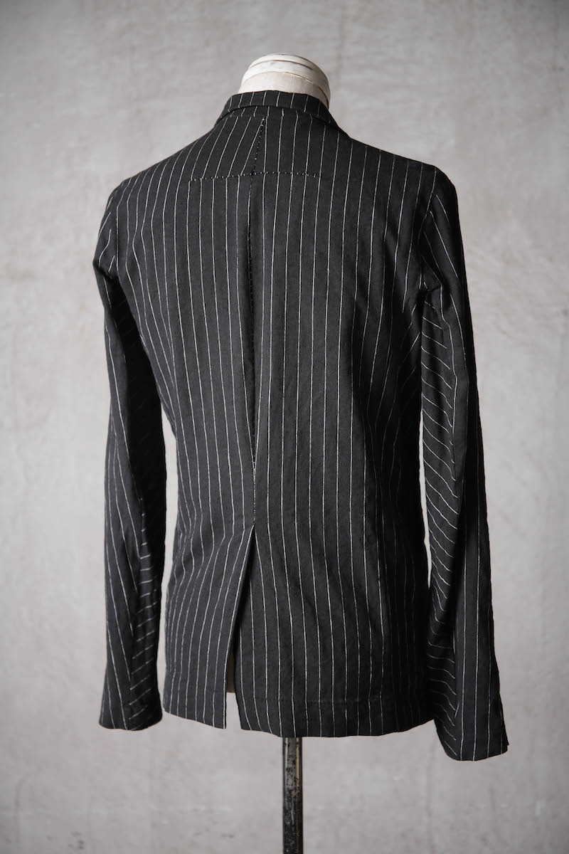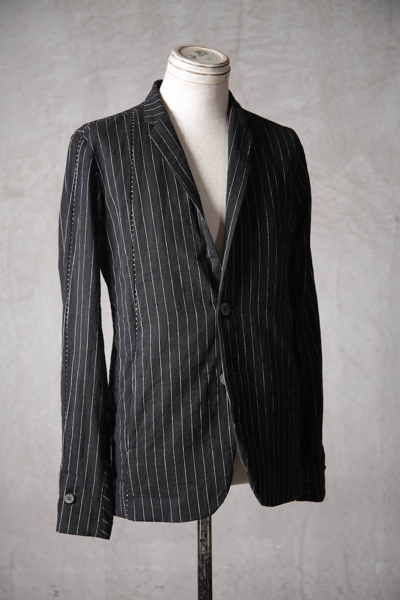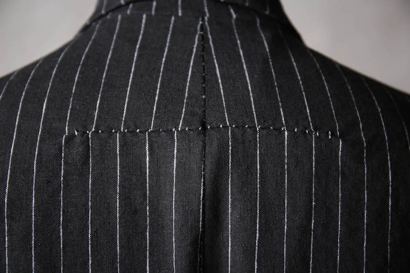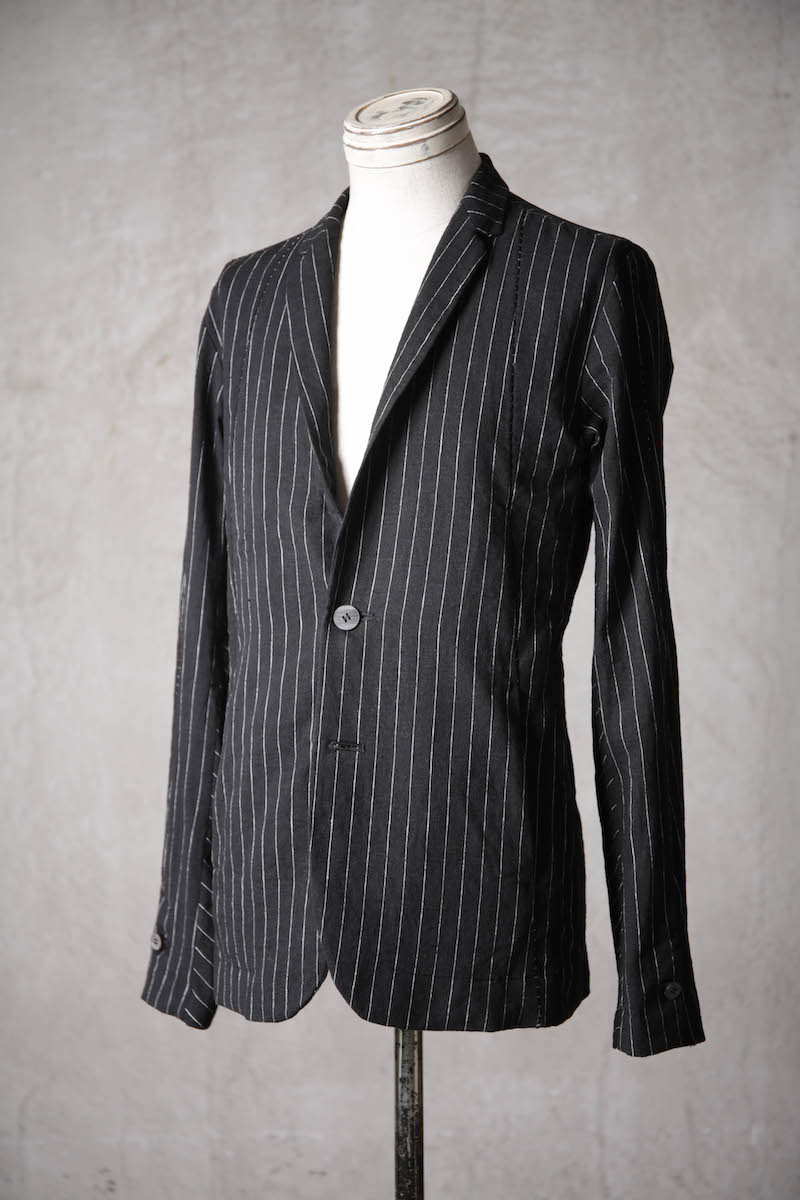 裏地のないモデルのためセンターベンツ、裾や袖口のステッチ処理を極限まで美しく魅せるために通常の叩きつけのステッチではなくルイスと呼ばれる特殊ミシンを使いステッチが目立たないような作りとしている。逆説的に各所にはステッチそのものがデザインともなるオーバーロックの処理をしてその相反する構造はジャケットに深く向き合ったデザイナーの意図である。