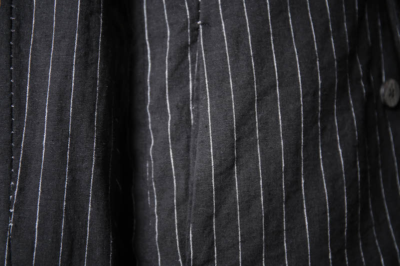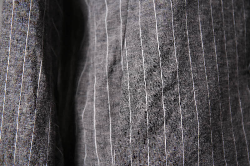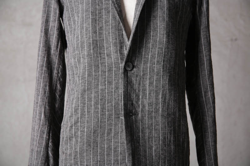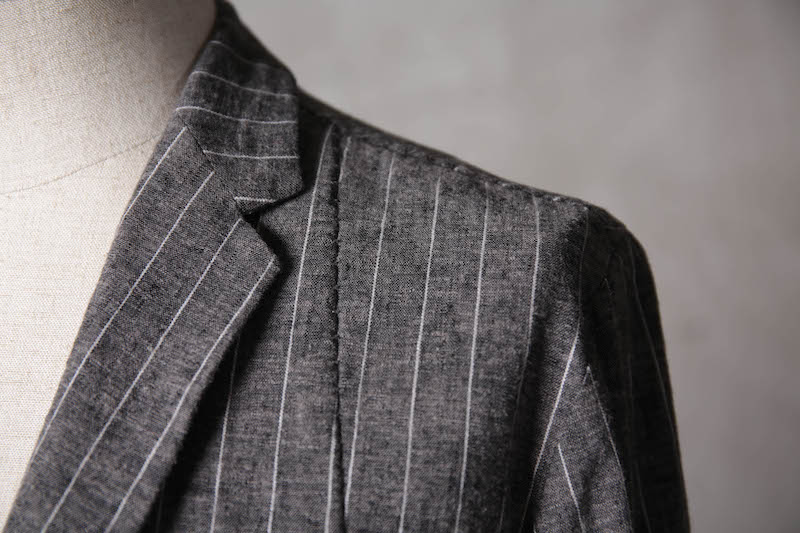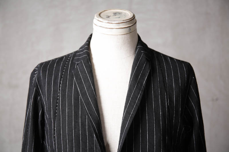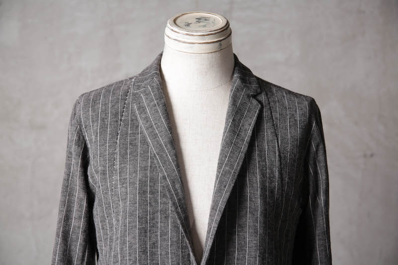 麻が本来持つ羽毛感をサイロ引きによって抑えながらも麻特有の質感とざっくり感を残し表情豊かなピンストライプが配された秀逸なデザイン性をも持った素材であり、その上でナチュラルなストレッチ感も含まれていることで着用感もまた素晴らしい。粗野感とドレス感を兼ね備えた最上質素材。