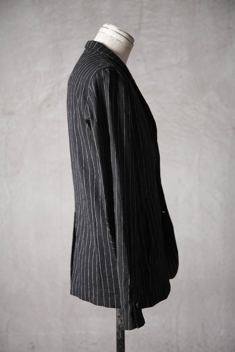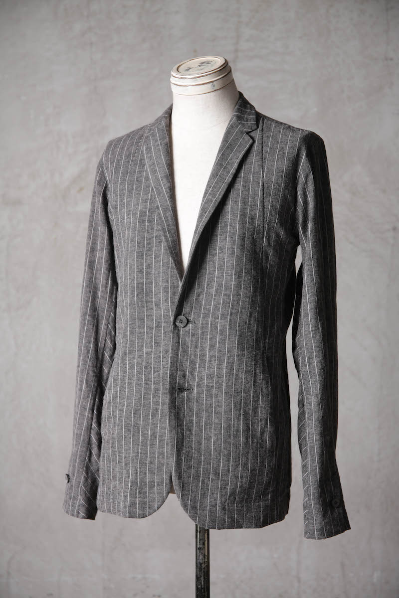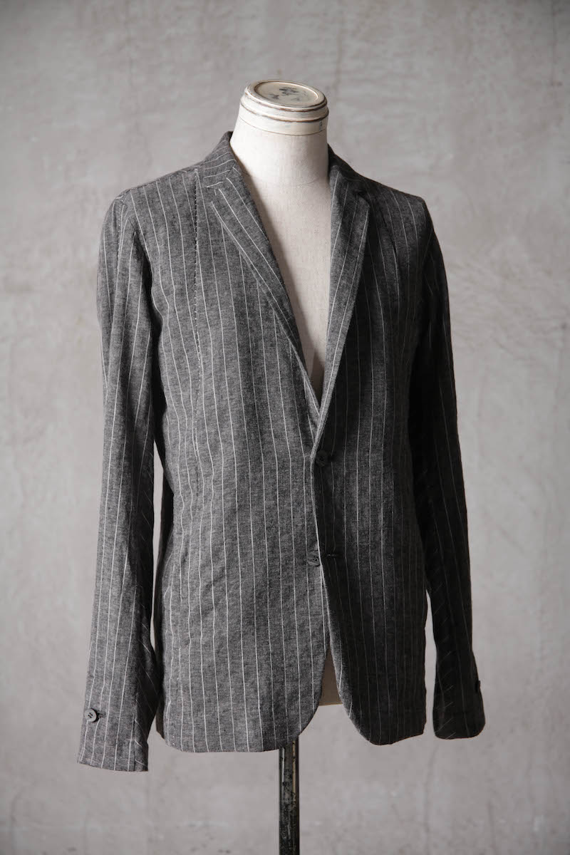 ハーベストスリーブ、スリット型のポケット、各所のオーバーロック等の構築構造をさらに製品に仕上げてから水洗いすることでスーツ的ジャケットの概念をラフな仕様へ仕立てている。(肩パット無し)