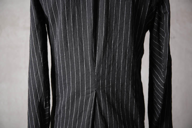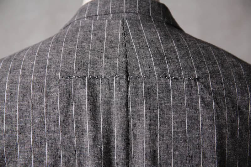 春夏専用仕立てとして裏地は背裏(観音仕様)を採用(前身頃のみ裏地あり)することで快適な着用感を味わうことが出来る。総裏地仕様でないながら身頃の内側にはスリット型のポケットもあり非常に使い勝手の良い構造にもなっている。