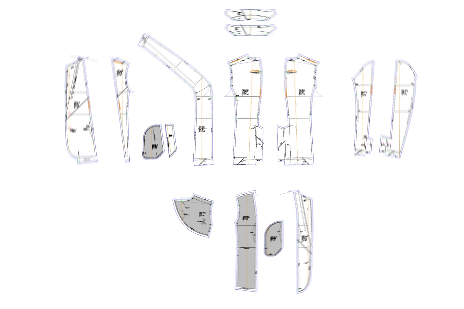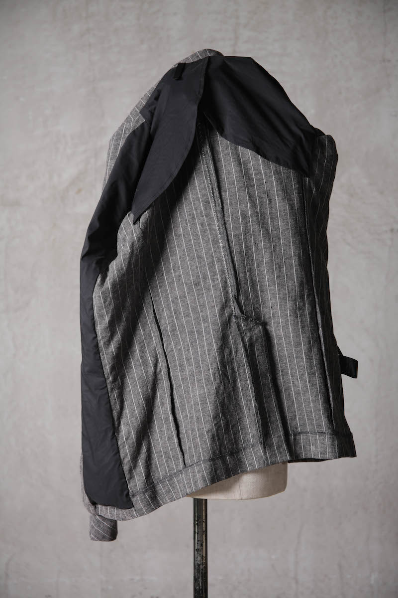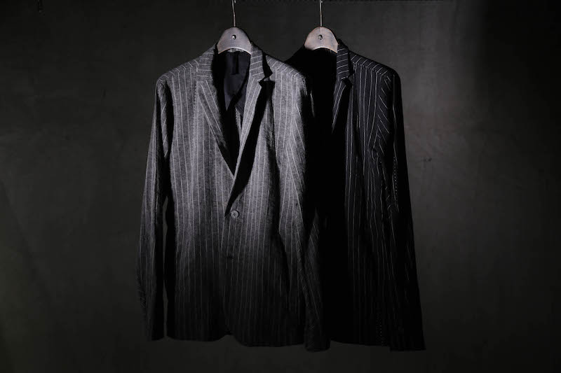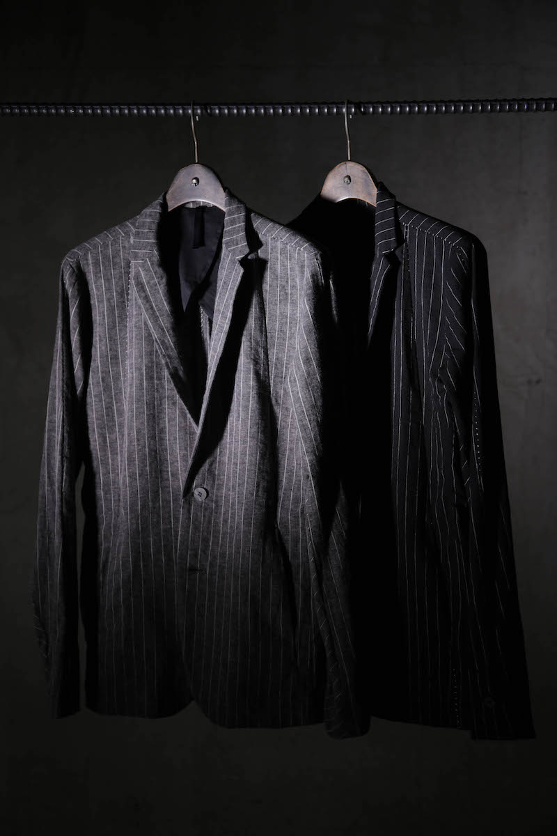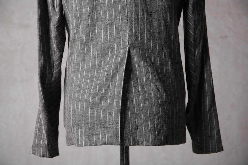 テーラードジャケットという普遍的なアイテムのアウトライン形状を保ちつつもブランド独自の解釈とパターニングで作製した。つまりはある固定化された概念的な構造を全て一度解体し構築し直す作業である。