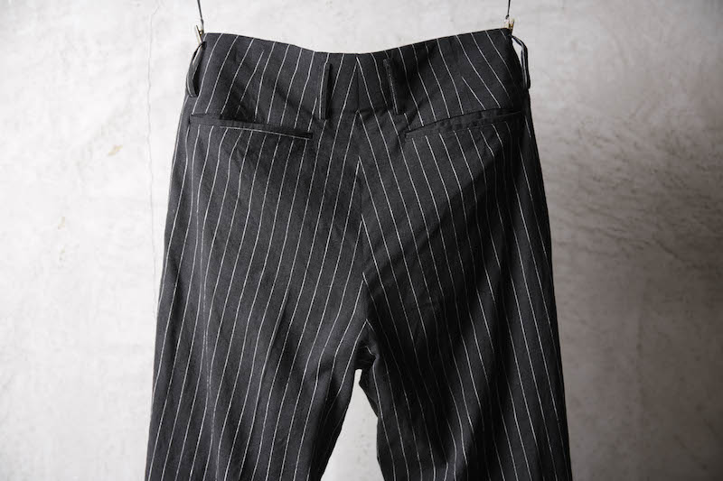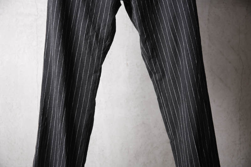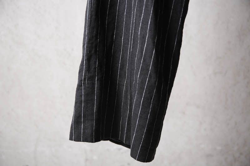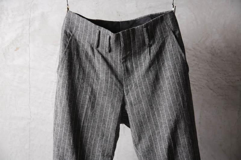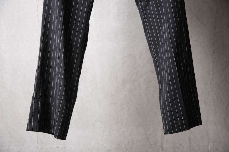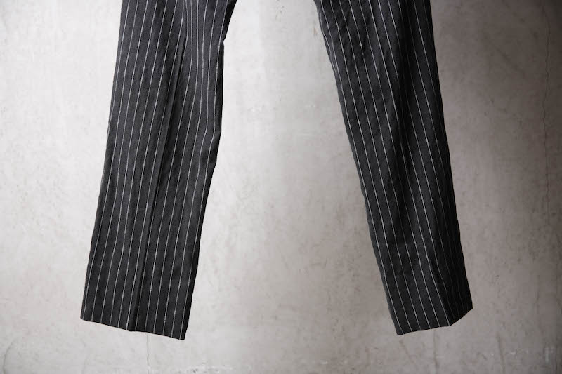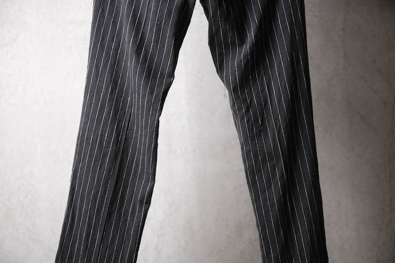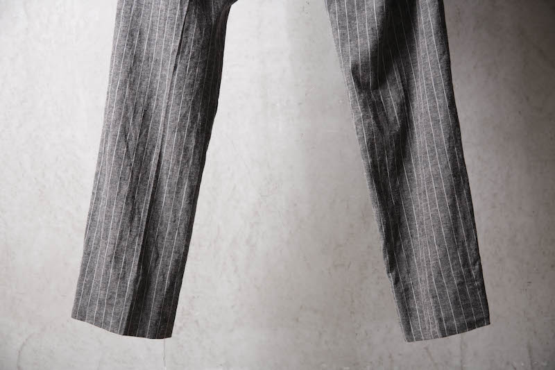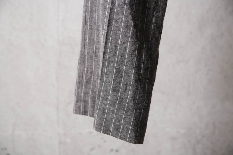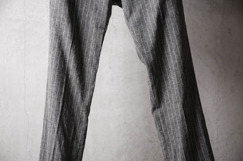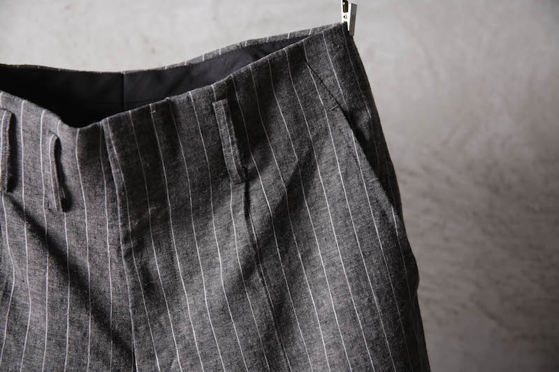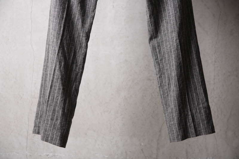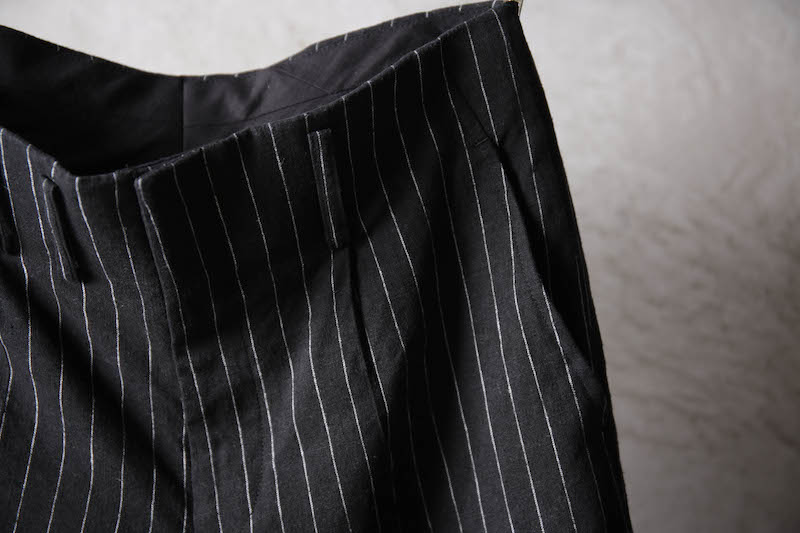 リネンストライプの生地を使用して作り上げたセットアップアイテムの中のラフフォルムパンツ。