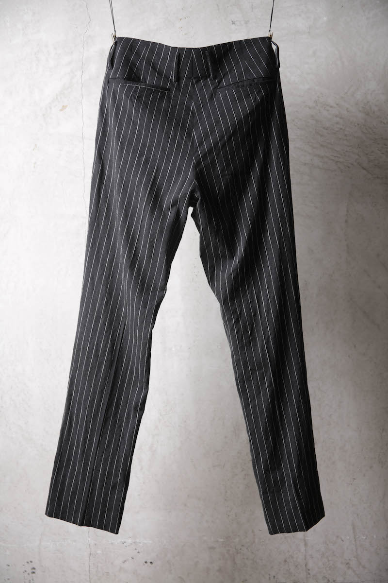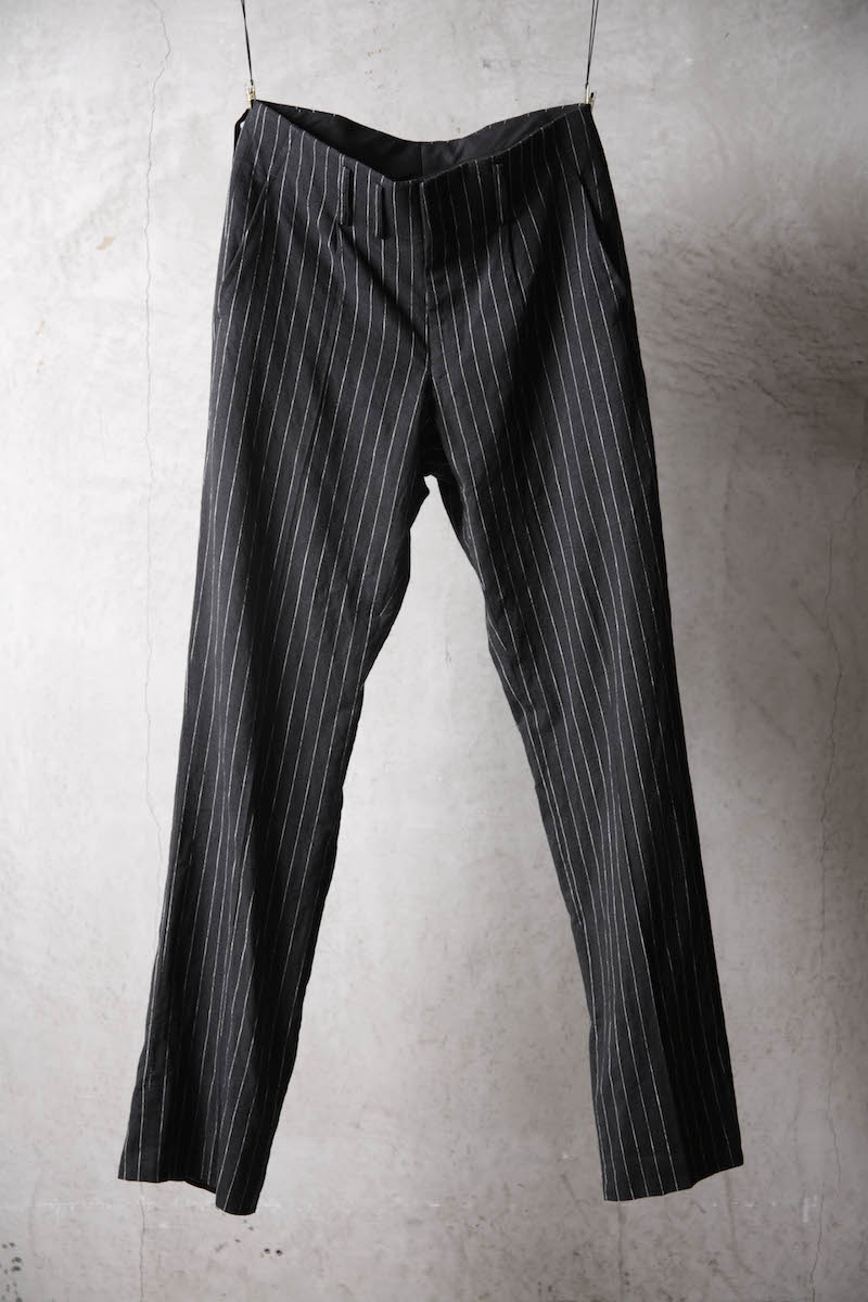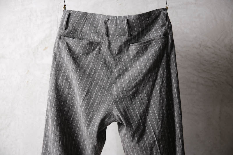 ワタリ巾から膝に掛けても通常のスーツではあまり見ることのないワイドさを表現し膝下からシューズラインまではしっかりとストイックな細さになるフォルムを演出している。また通常は存在するパンツウエストの帯を排すことやウォレットチェーンが掛けやすいよう右フロントのみベルトループを1本追加することでよりラフな印象に作り上げた。相反するようにディティールと仕上げはスラックスらしさを作りフロントはセンタープレスを掛けてスラックスシャープさを印象づけた。ポケット構築はフロントサイドは使い勝手の良いスラント型を採用(忍びポケット=コインポケット仕立て)、バックスタイルでは左右の片玉ポケットを採用。ZIPにはYKK社の最上質ラインであるEXCELLAを採用し滑りの良さと光沢の美しさに加え耐久性を兼ね備える。スーツパンツらしくウエストフロントはテング仕様、前面は裏地仕様、ウエストマーベルト仕立てとアウトラインのシンプルさからは見ることの出来ない存分なほどのディティールを詰め込んだ仕様となっている。