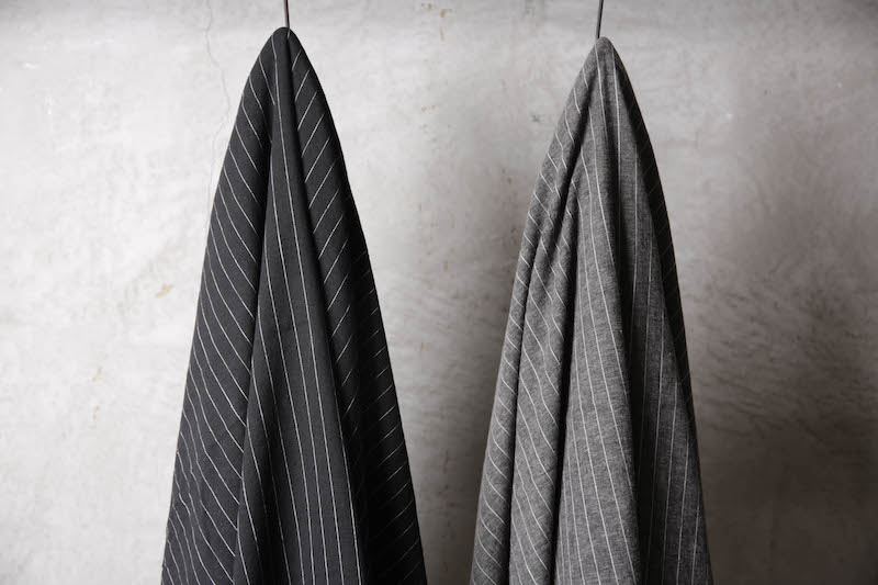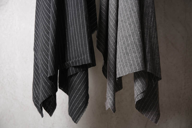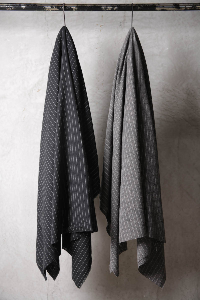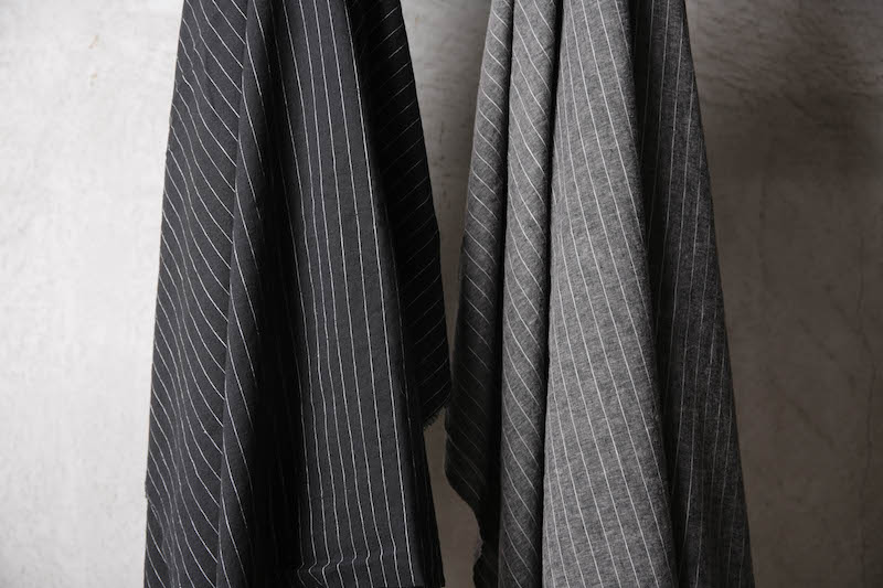 麻が本来持つ羽毛感をサイロ引きによって抑えながらも麻特有の質感とざっくり感を残し表情豊かなピンストライプが配された秀逸なデザイン性をも持った素材であり、その上でナチュラルなストレッチ感も含まれていることで着用感もまた素晴らしい。粗野感とドレス感を兼ね備えた最上質素材。