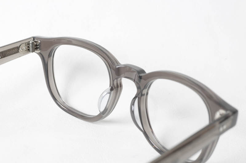 完全プラスチック素材であるアセテートに比べ、植物由来の合成樹脂であるセルロイドは弾力性と硬質性という相反するそれぞれの長所を併せ持ち、熱に対しての融点が低いことで製作には特別な技術を必要とするが、その弾力性が持つ機能のために着用することで自身の体温によりブリッジ形状や耳に掛るテンプルなどが顔馴染みをしてくれるのが最大の魅力。つまりはレザーアイテムと同じく馴染みが生まれることでその人のとっての唯一無二の存在に育っていくことが大きな特徴であり最大の魅力であると考えている。