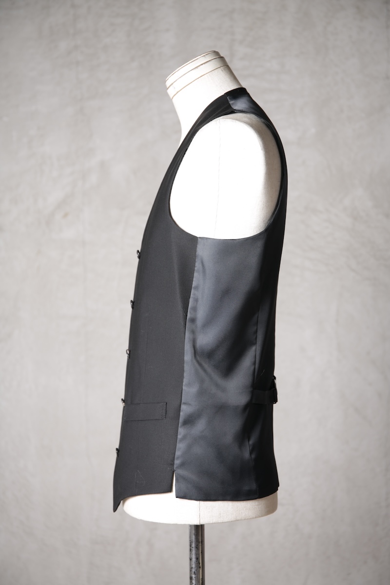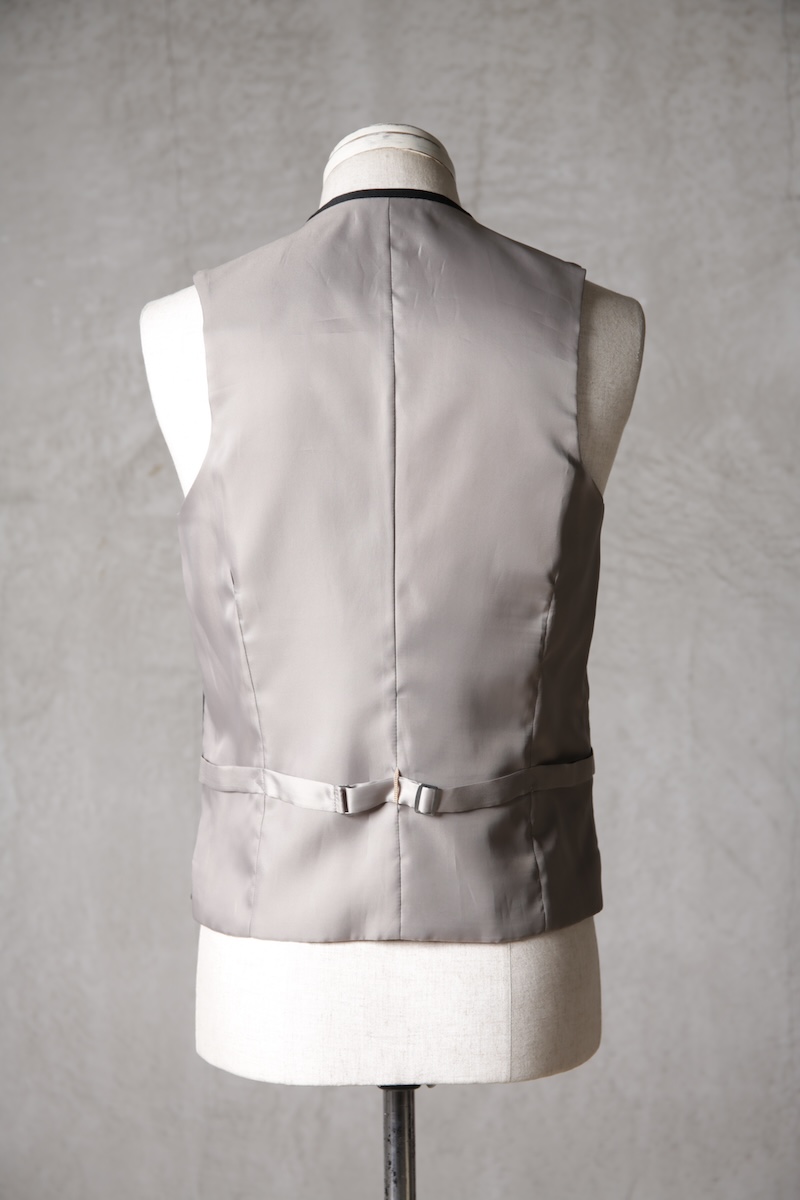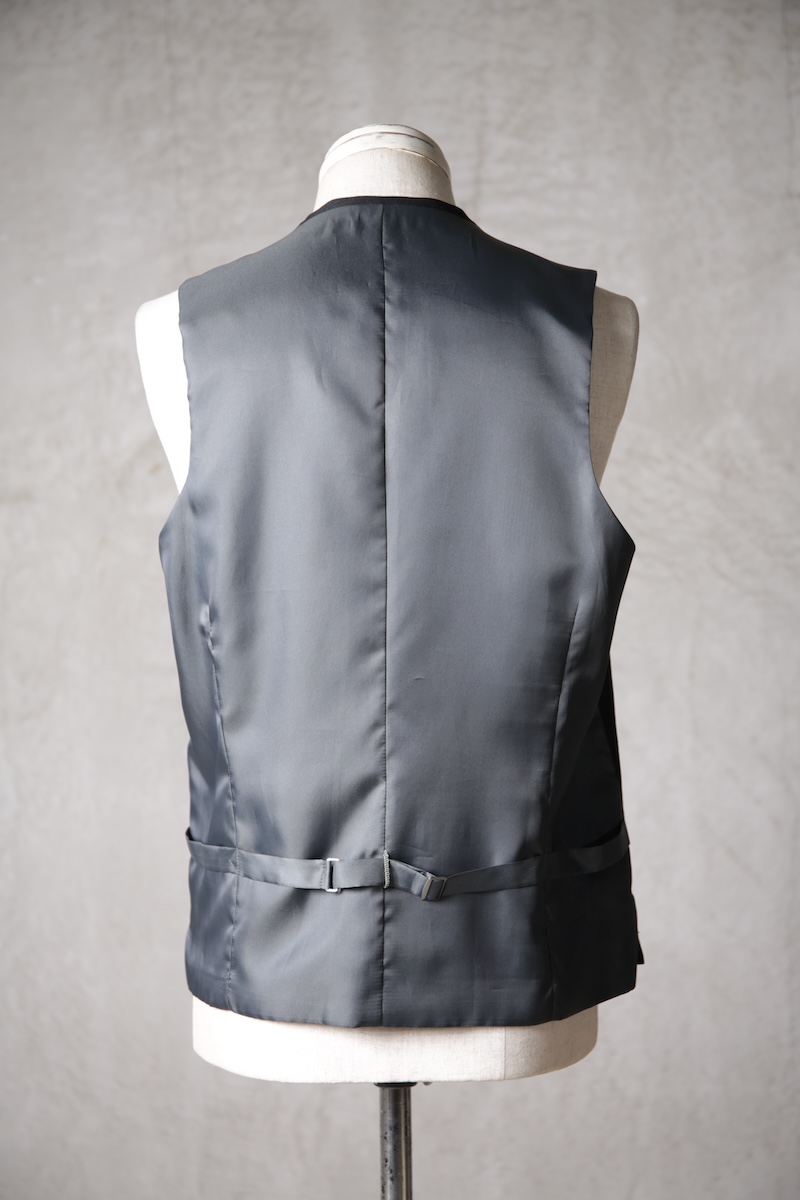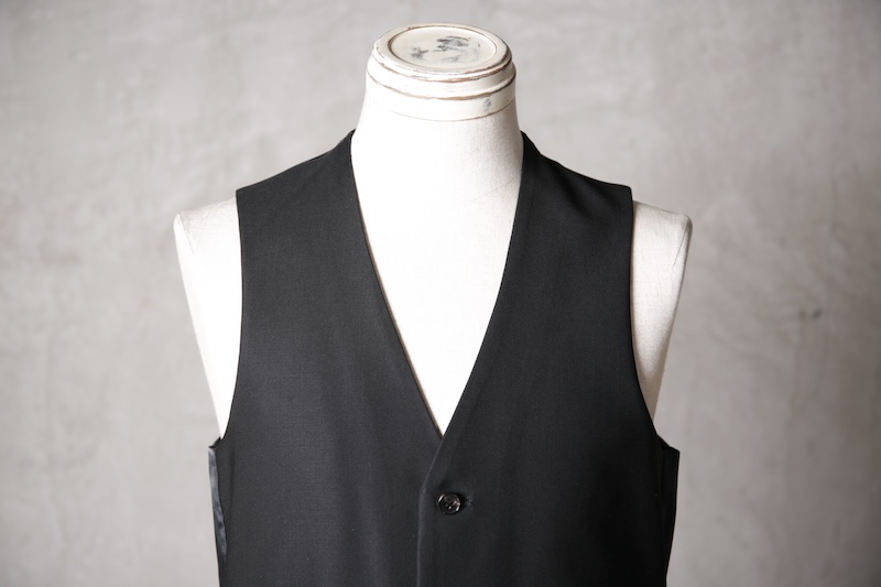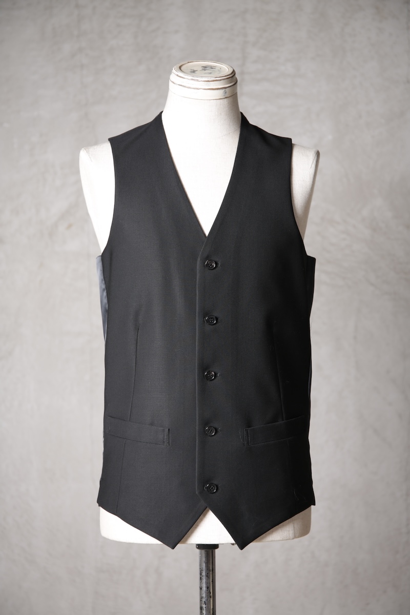 オーソドックスでシンプルな5つボタンのジレでジャケットとの組み合わせはもちろんのこと単体での着用デザインも意識したフォルム構築を行った。適度に着丈を長めに確保することによりよりカジュアルライクな印象を持ちシャツとの合わせやTシャツなどのアイテムともバランスの良いレイヤードスタイルを作り出すことが出来ることに重きをおいた。腰ポケットの配置や左右切り返し部分にさり気なく配したスリットがあることにより着用時の落ち着き(特に座式でのスタイル)も出るためスーツスタイルはもちろんのことイージーな使い勝手にも特化しているのが大きな特徴と言える。一般的にはボックススタイルが多いジレであるがこのブランドの考えるシャープさとストイックさを演出するためにフロントと背面に余分な生地余りを廃するためのバーチカルなダーツを配しているのも見どころである。