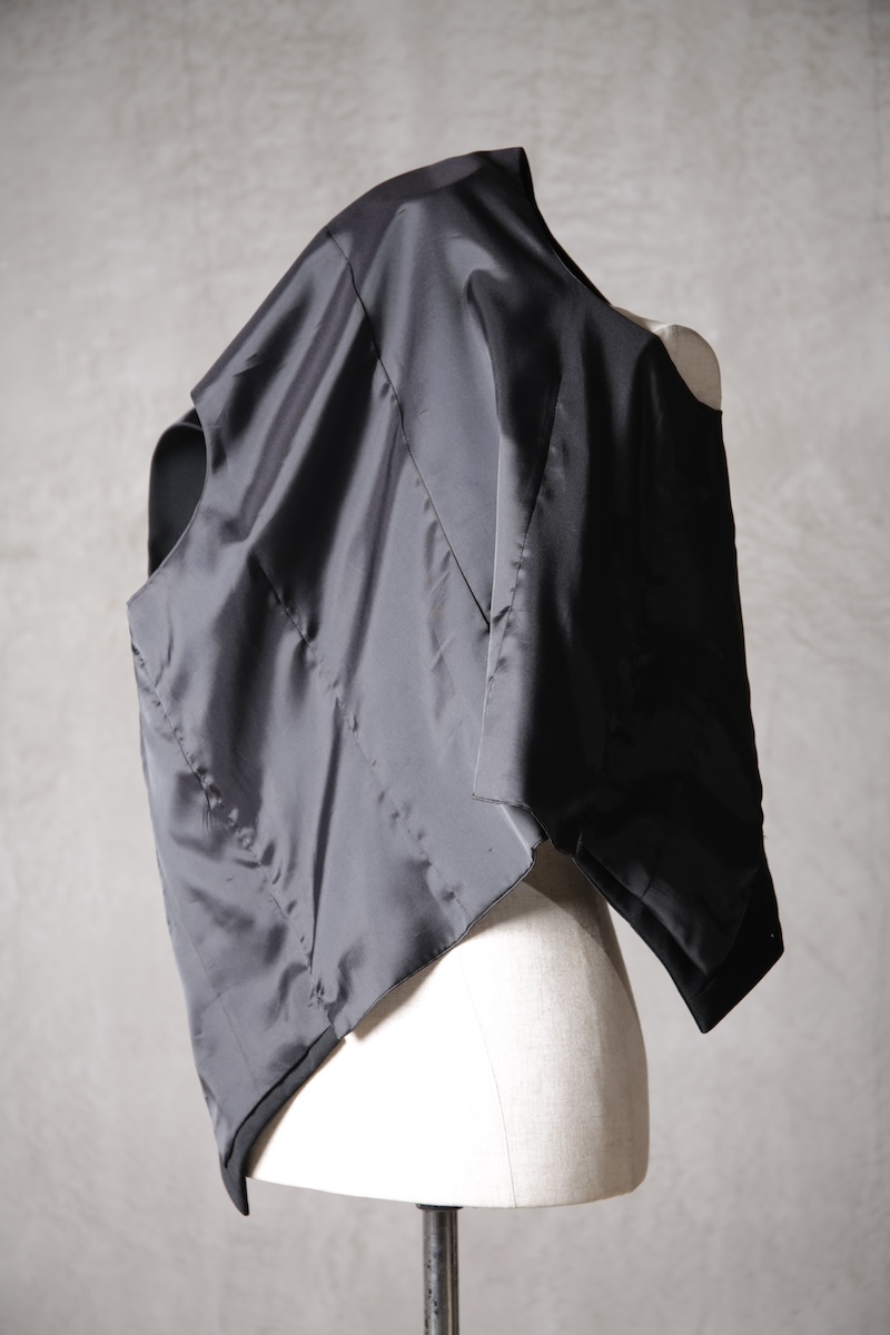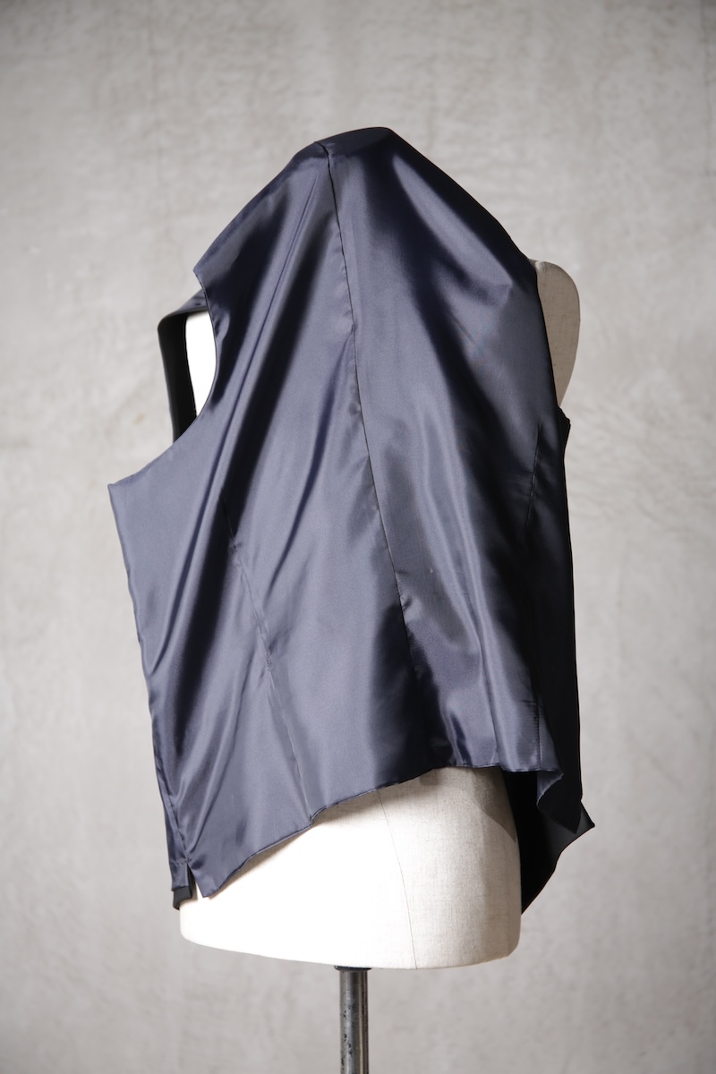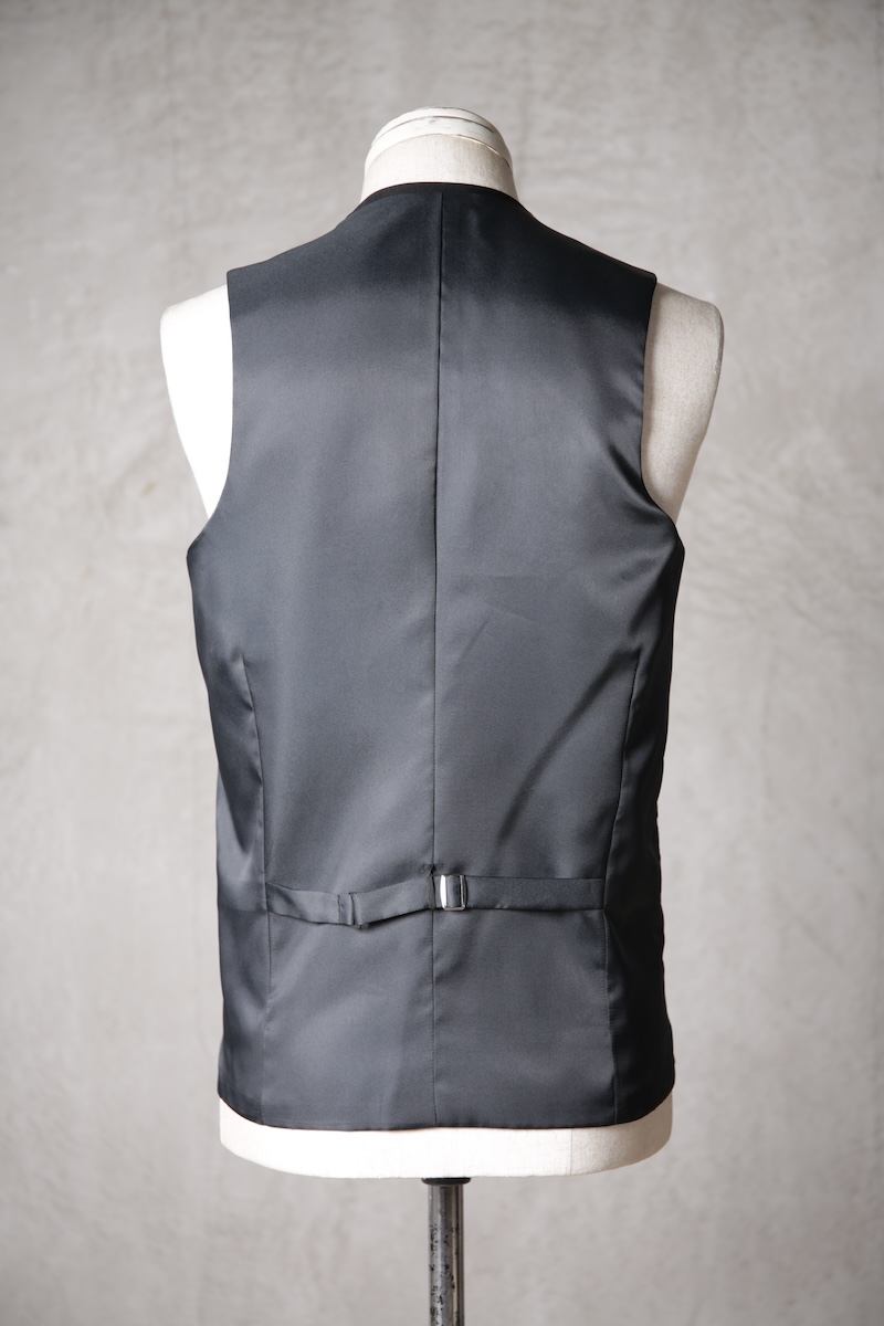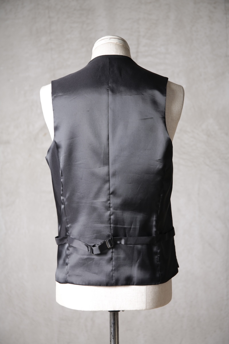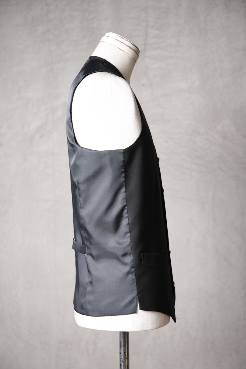 オーソドックスでシンプルな5つボタンのジレでジャケットとの組み合わせはもちろんのこと単体での着用デザインも意識したフォルム構築を行った。適度に着丈を長めに確保することによりよりカジュアルライクな印象を持ちシャツとの合わせやTシャツなどのアイテムともバランスの良いレイヤードスタイルを作り出すことが出来ることに重きをおいた。腰ポケットの配置や左右切り返し部分にさり気なく配したスリットがあることにより着用時の落ち着き(特に座式でのスタイル)も出るためスーツスタイルはもちろんのことイージーな使い勝手にも特化しているのが大きな特徴と言える。一般的にはボックススタイルが多いジレであるがこのブランドの考えるシャープさとストイックさを演出するためにフロントと背面に余分な生地余りを廃するためのバーチカルなダーツを配しているのも見どころである。