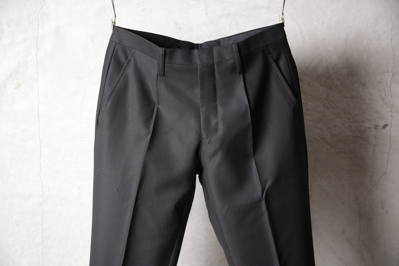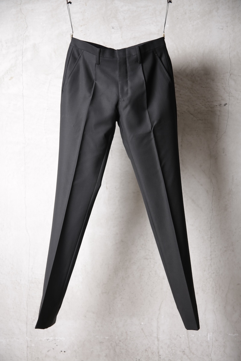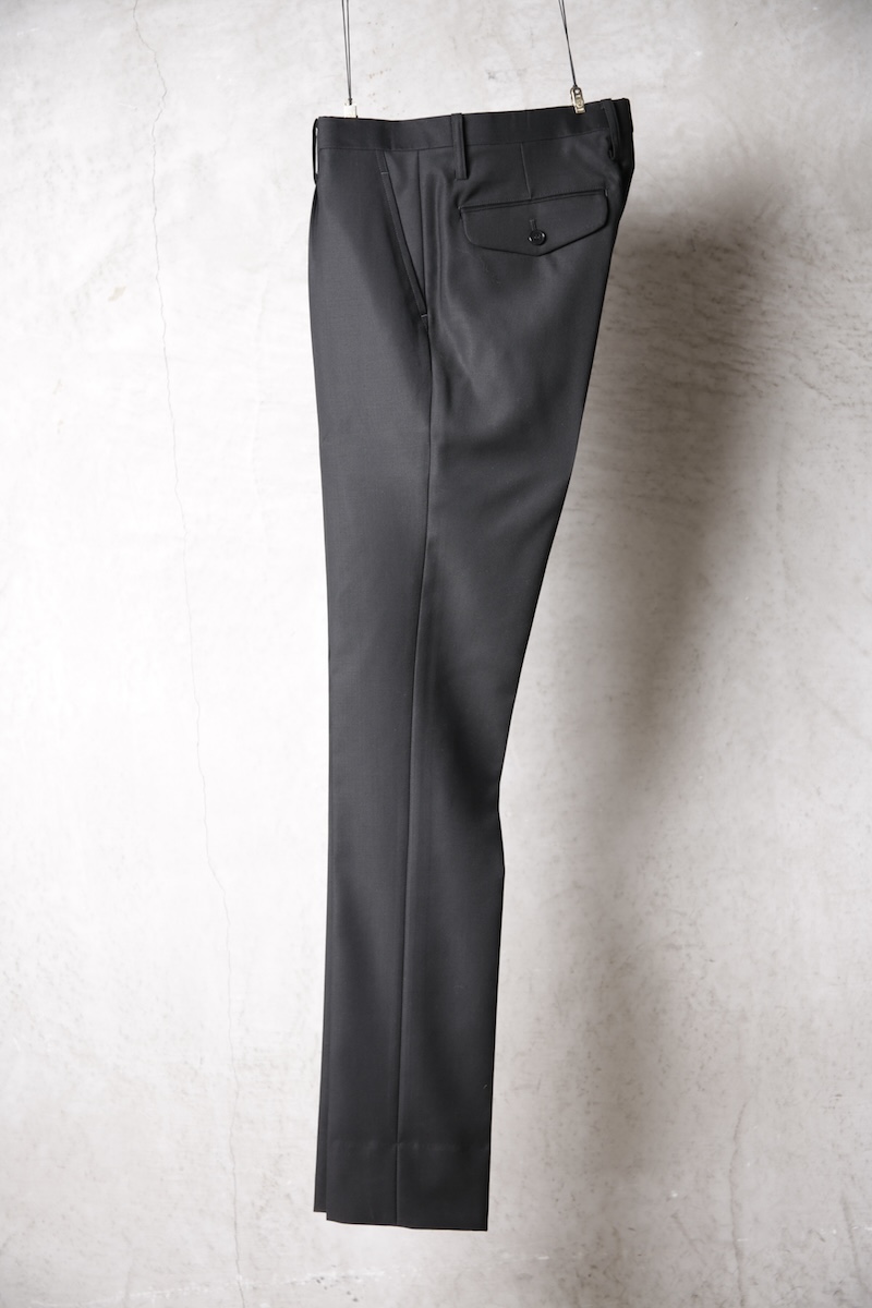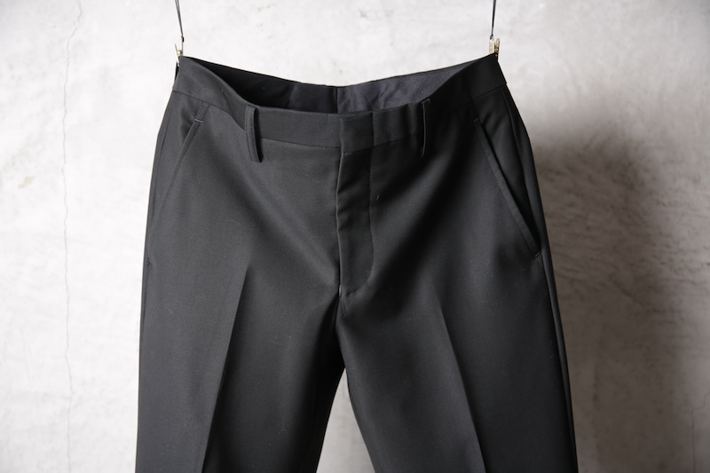 退廃さと空虚、削ぎ落とされたシャープさ。そういったブランドイメージを具現化したタイトフォルムのストイックなパンツ。ワタリ巾から膝に掛けても通常のスーツではあまり見ることのないタイトさを表現し膝下に掛けてもシューズラインまでしっかりとストイックな細さを演出している。ただし、アウトタックの分量を1cm程度確保することで着用においては過度なストレスを軽減させるようなデザインワークの作り込みも大切なディティールの1つである。仕上げはフロントはセンタープレスを掛けてさらなるシャープさを印象づけた。ポケット構築はフロントサイドは使い勝手の良いスラント型を採用(忍びポケット=コインポケット仕立て)、バックスタイルではウォレットなどの差し込みを考慮して右サイドは片玉ポケット、逆側である左サイドは雨フラシポケットを採用している。ZIPにはYKK社の最上質ラインであるEXCELLAを採用し滑りの良さと光沢の美しさに加え耐久性を兼ね備える。スーツパンツらしくウエストフロントはテング仕様、前面は裏地仕様、ウエストマーベルト仕立てとアウトラインのシンプルさからは見ることの出来ない存分なほどのディティールを詰め込んだ仕様となっている。