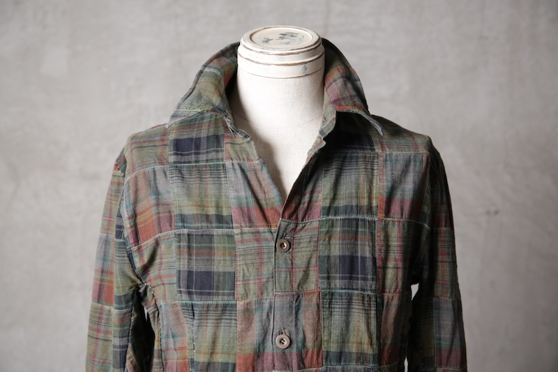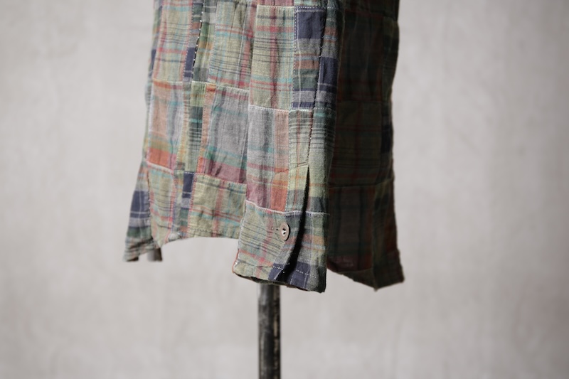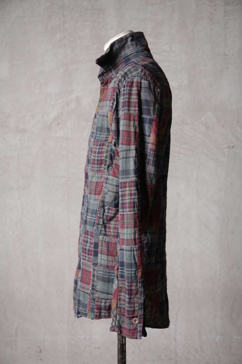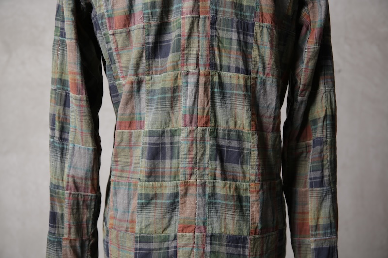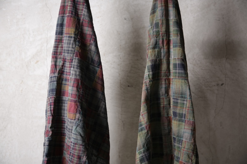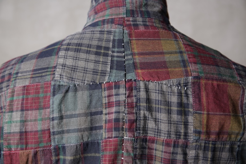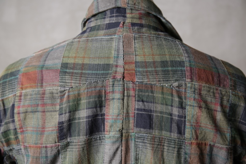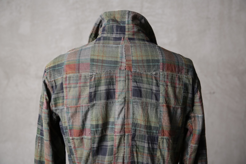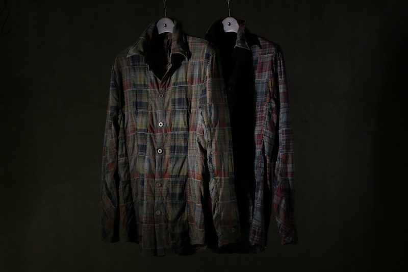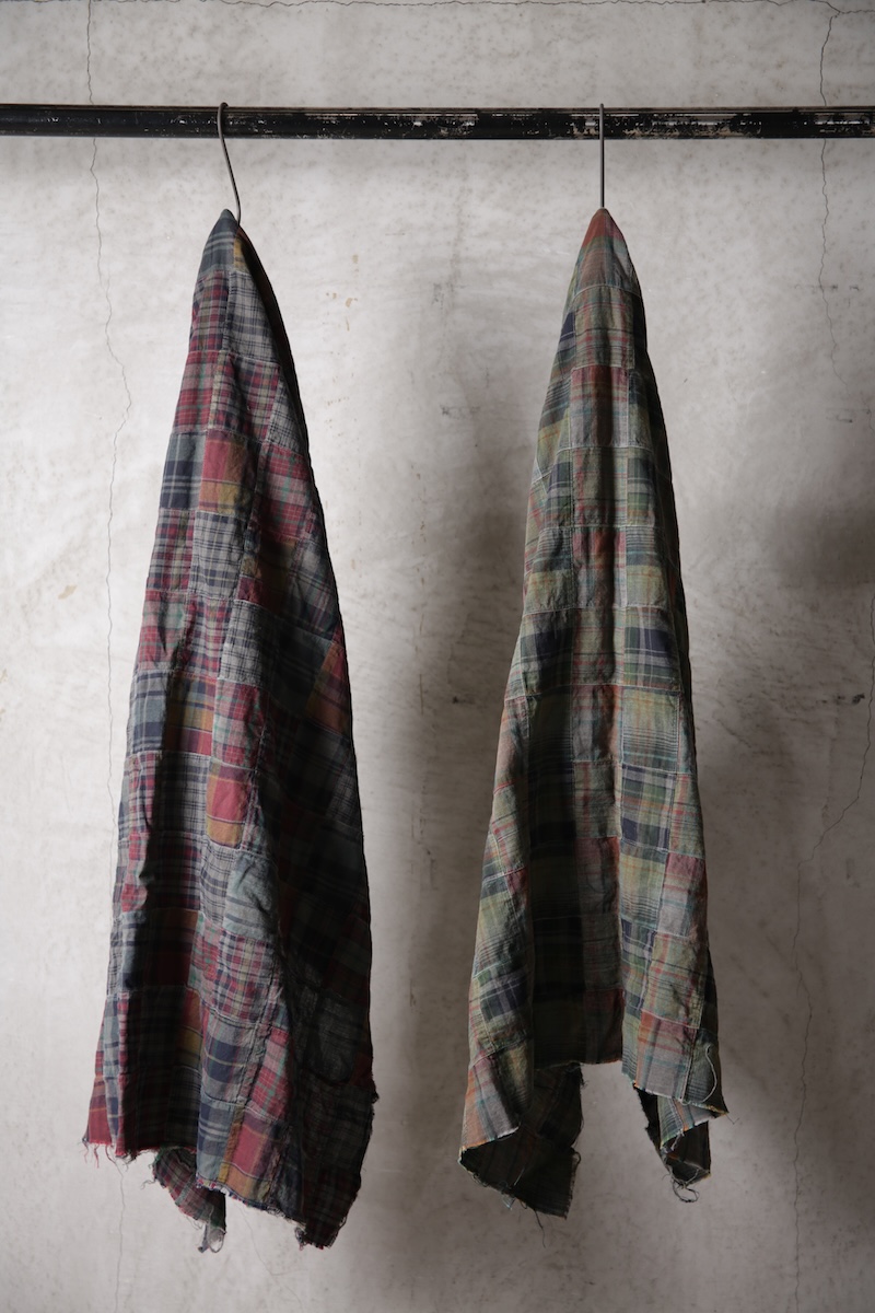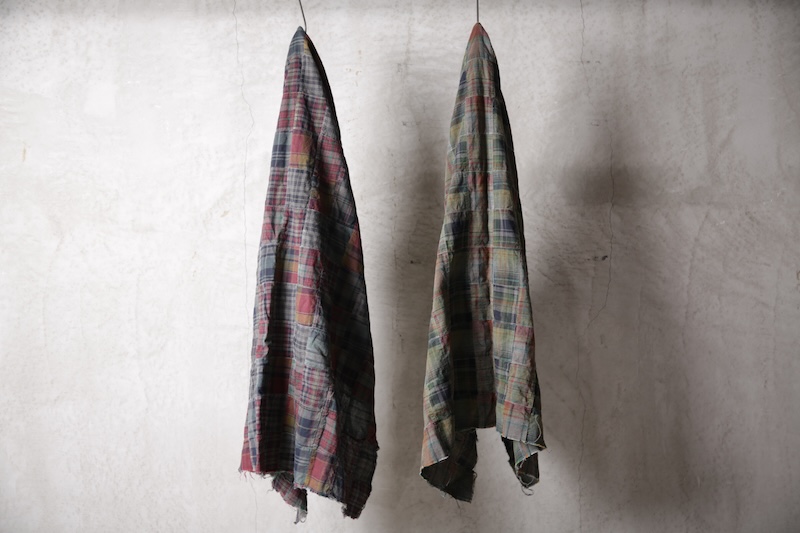 その意図を持って解体されたチェックのパッチワークとして紡ぎ合わせ、その上からさらに日本古来から存在する墨汁での染み込み染めを施したアイテム。